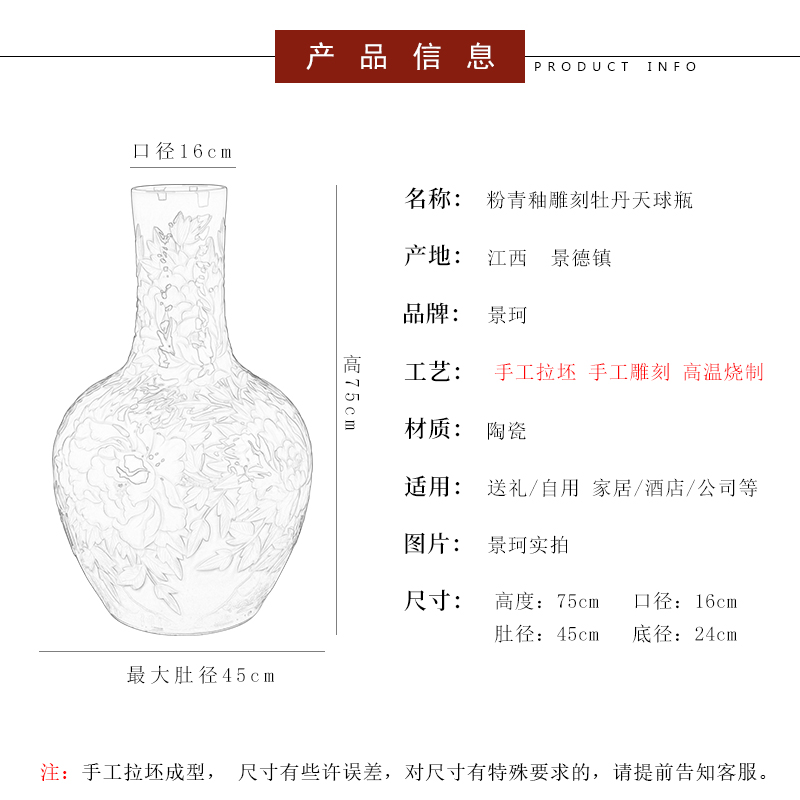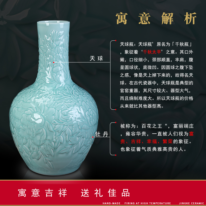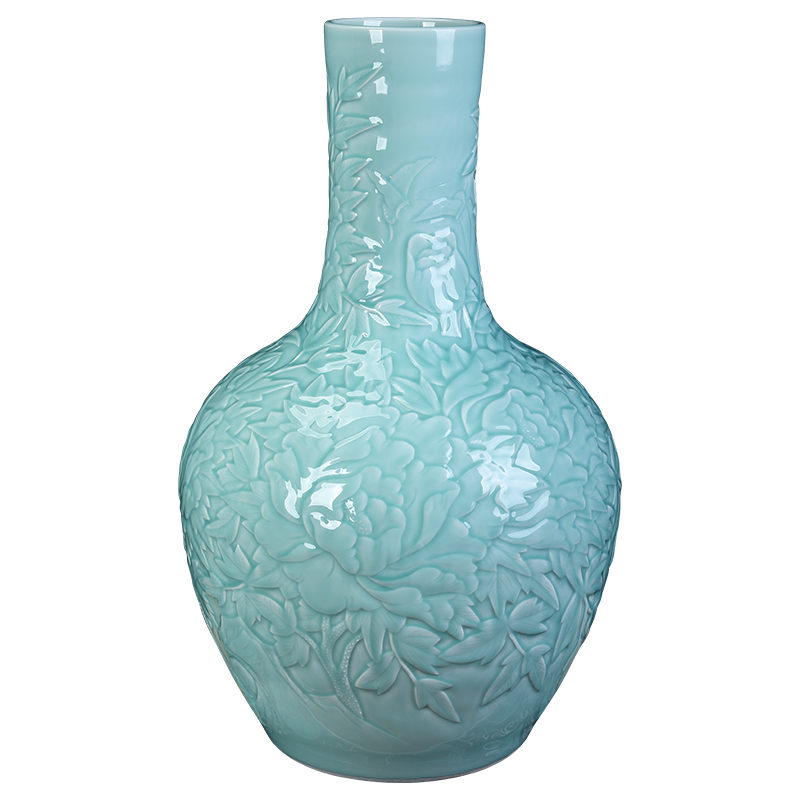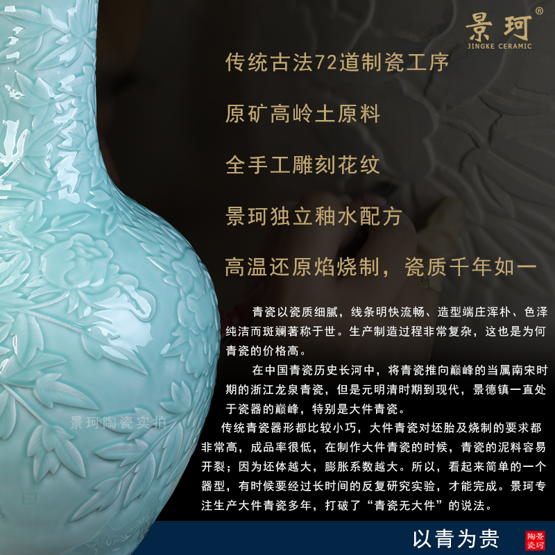 Jingdezhen ceramics green glaze carving peony floor large vase home living room flower arrangement sky ball decoration ornaments