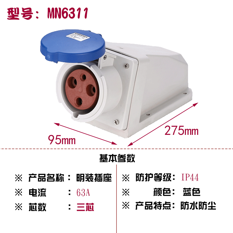 Zhejiang Guoan MN6311 Design MNIEKNES220V Three holes IP44 blue Ming dress waterproof industrial socket 2P E