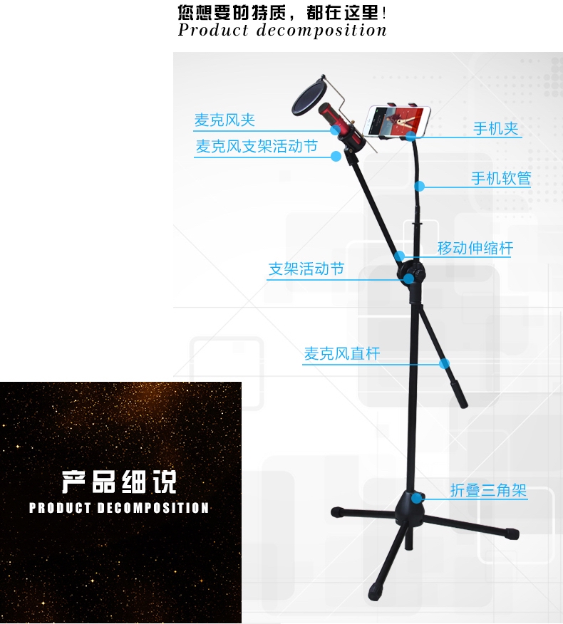 Wholesale mobile phone live broadcast bracket multi-function fast-hand universal universal microphone microphone floor-standing three-leg anchor