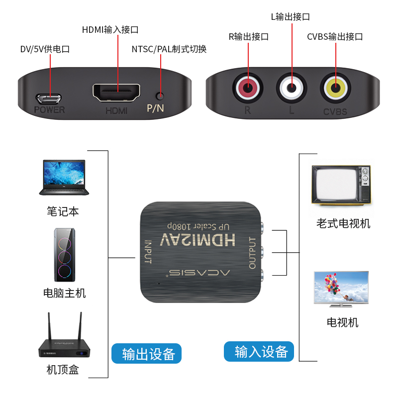 Acasis HDMI to AV converter Set-top box Computer to TV cable Tricolor HD no color difference 1080P conversion Barley Millet network box RCA to HDMI pen
