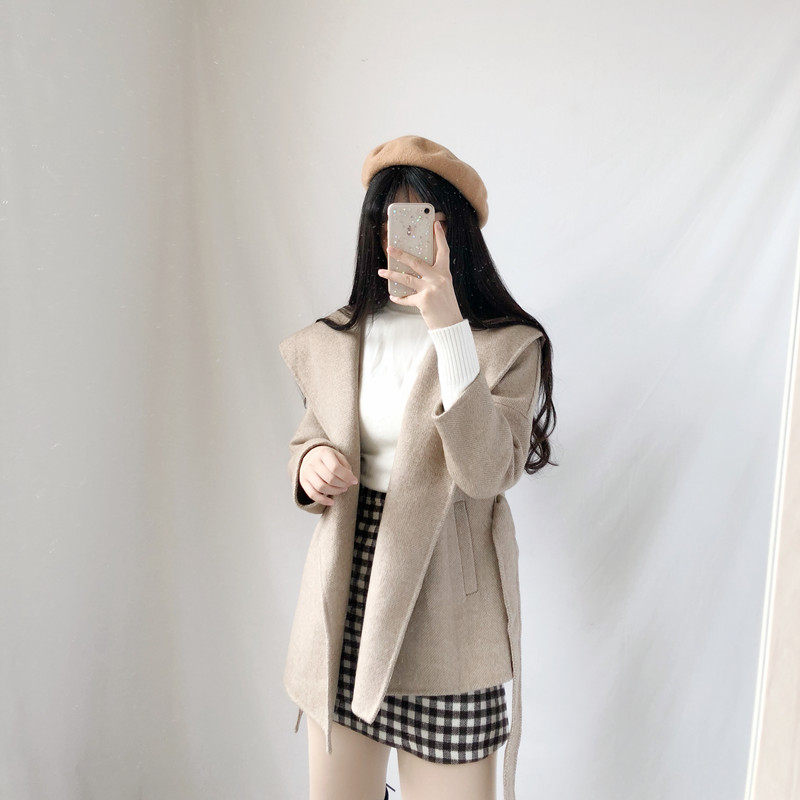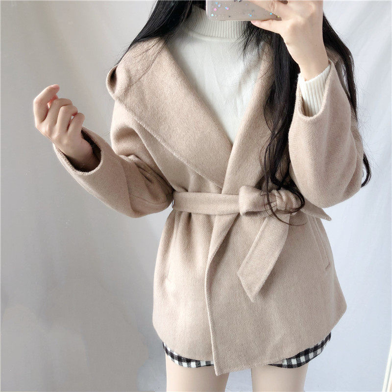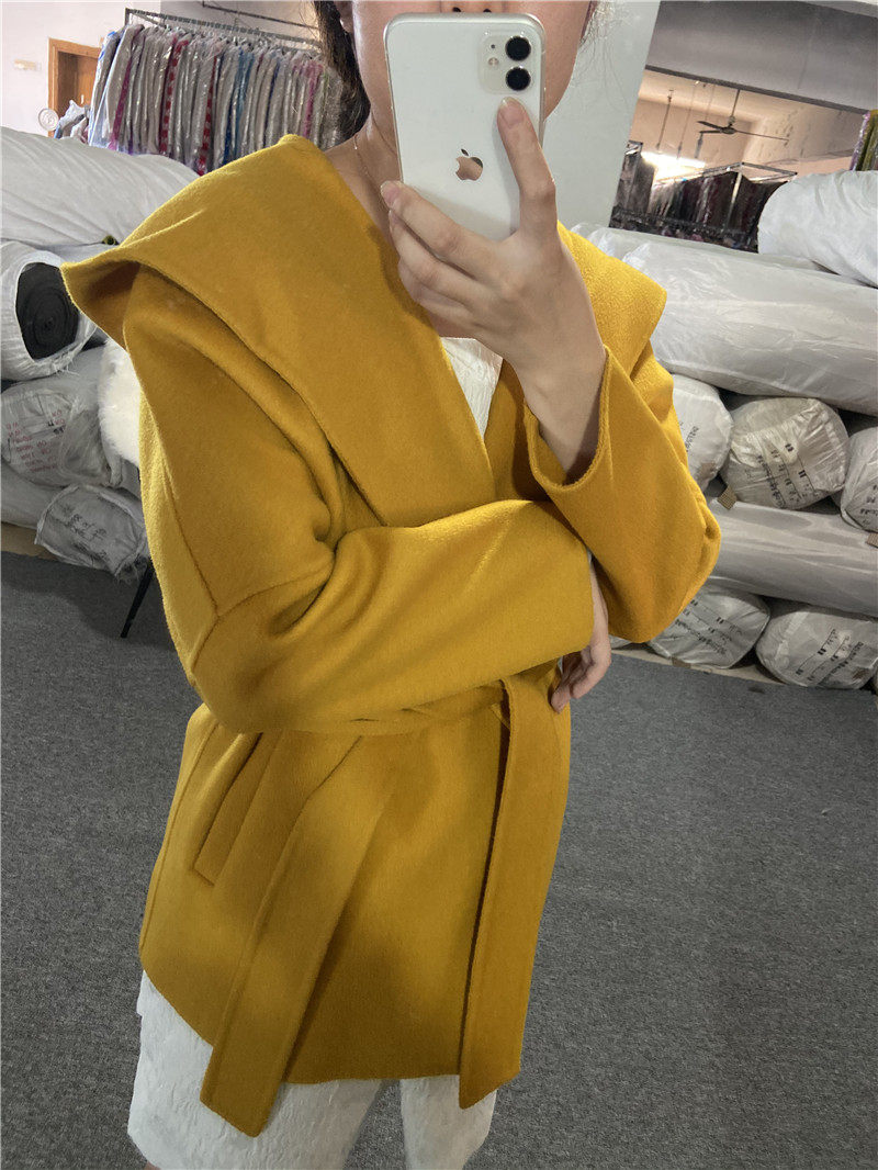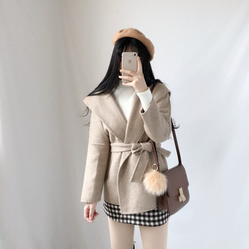 2022 autumn and winter new double-sided woolen coat women's Korean version herringbone pattern hooded short woolen coat with belt