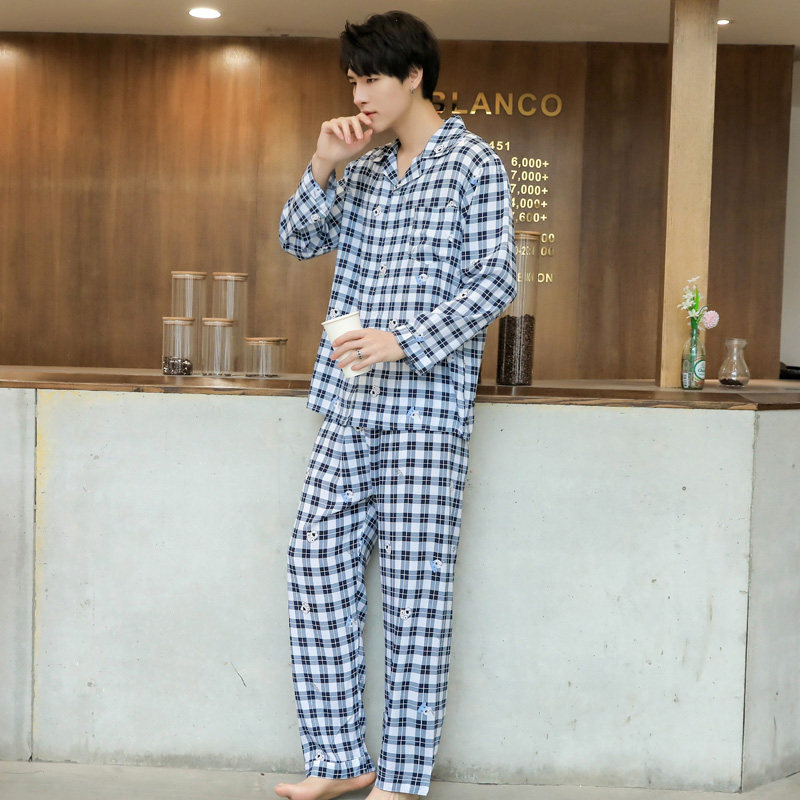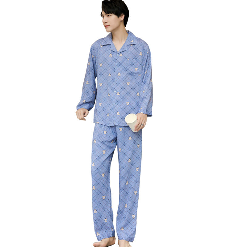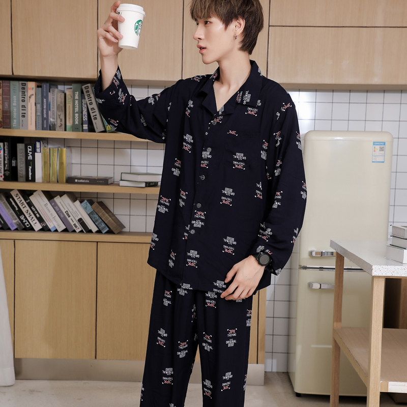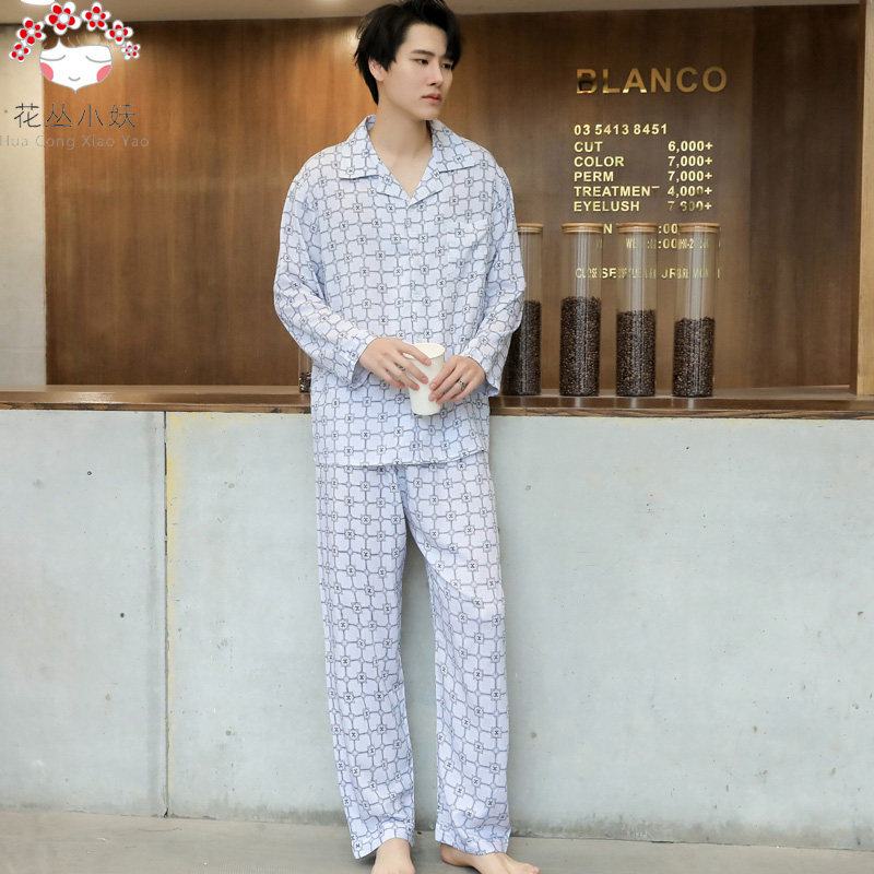 Middle-aged and elderly men's summer air conditioner cotton silk man-made cotton lapel long-sleeved trousers pajamas cotton silk spring and autumn home service suit