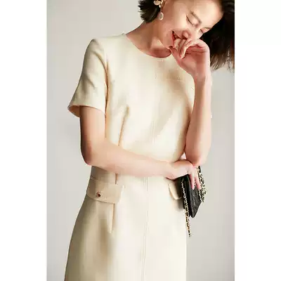BEEWOOD Bi Wutong waist slim short sleeve medium and long version one-step skirt solid color temperament slim dress round neck