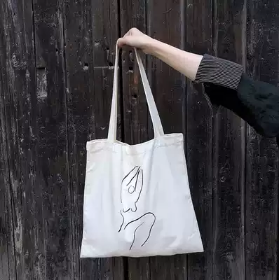 AL homemade simple MW abstract body painting canvas bag ins Wind beige white shoulder Women's bag cotton bag