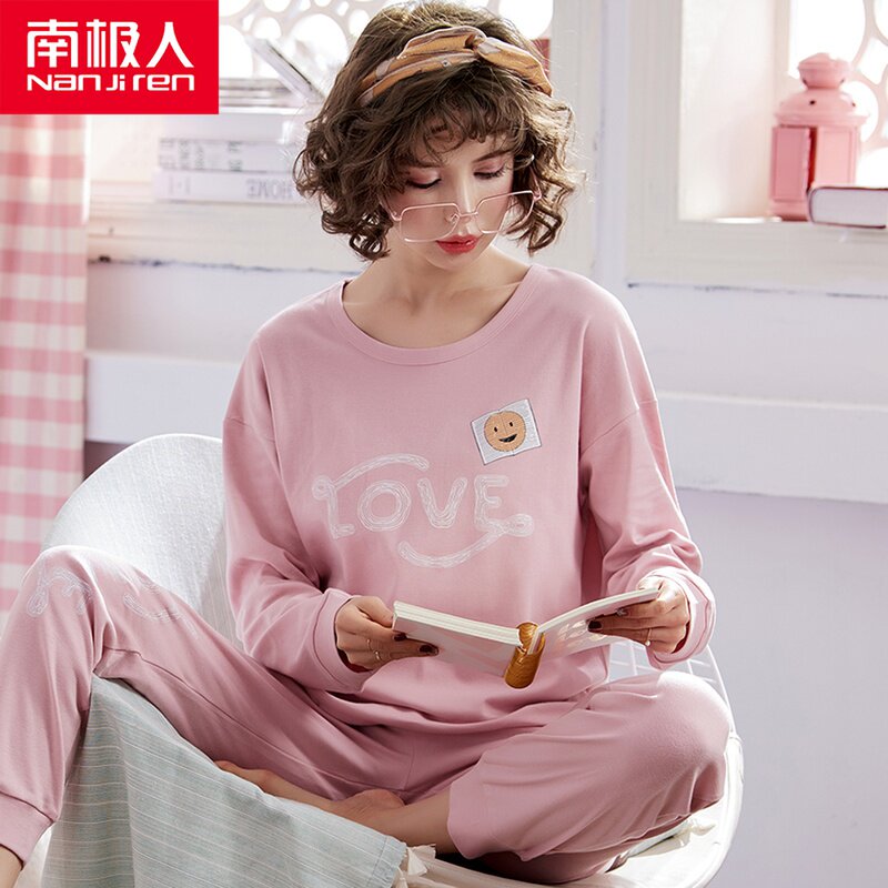 Sleepwear woman long sleeve pure cotton spring and autumn thin style suit round neckline large size Korean version Two sets of casual home wear can be worn out