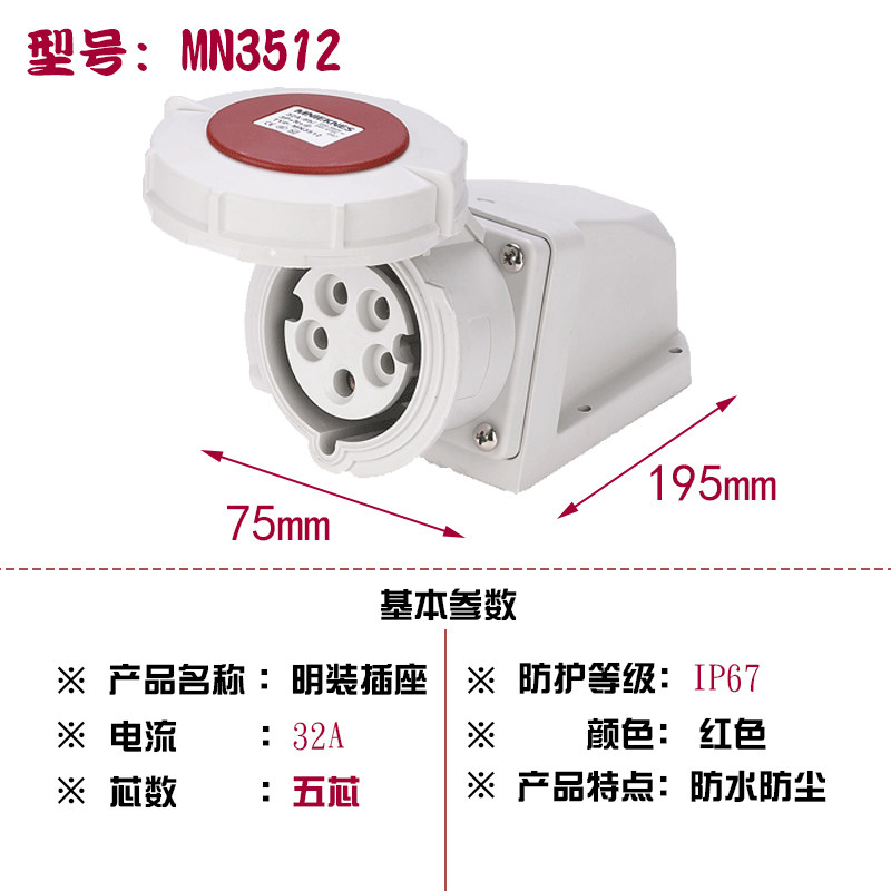 3P Zhejiang Guang ManMNIEKNES three-phase 32A Five holes 380V Industrial Ming-fit IP67 waterproof socket MN3512