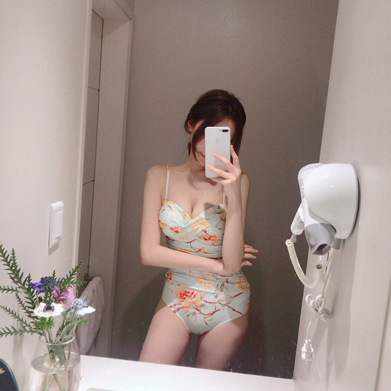 Korean small chest steel support gathered one-piece swimsuit sexy slim big breasts bikini vacation conservative belly cover swimsuit women