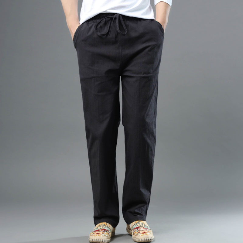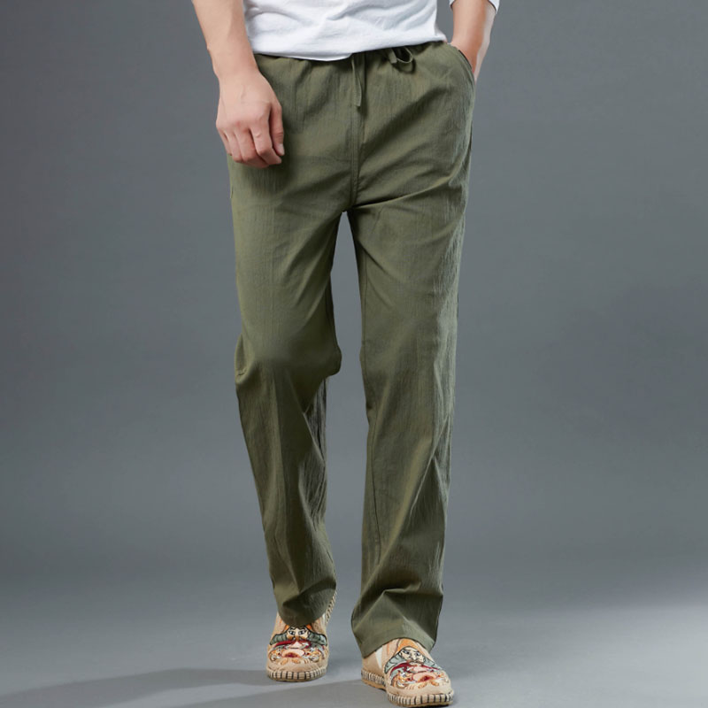 Chinese men's cotton linen casual long pants retro comfort Breathable Residence Zen Tea Pants Tightness Waist Draw Rope Straight Drum Pants