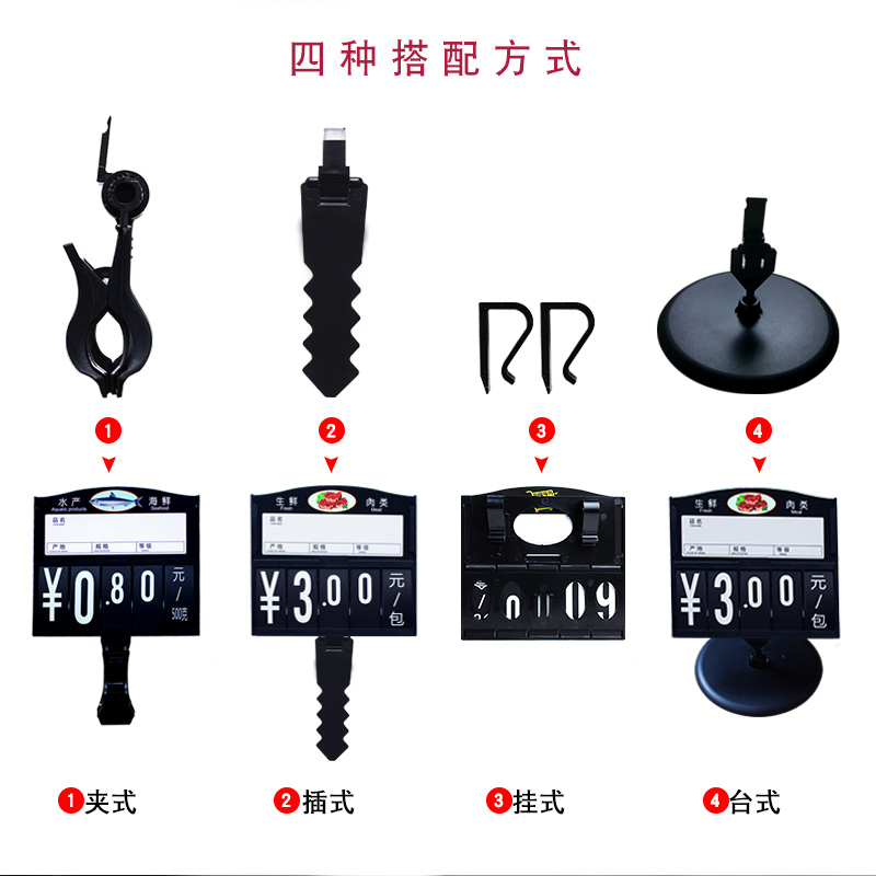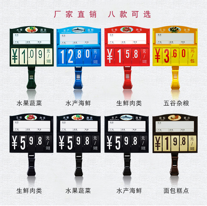 Clip-on black fruit and vegetable area 10 clip-on dark green fruit and vegetable area 10 clip-on black chill area 10 clip-on black fresh area 10 clip-on black fresh meat area 10 clip-on red fresh meat area 10 clip-on yellow grain area 10 clip-on coffee bread area 10 plug-in black fruit and vegetable area 10 plug-in one dark green fruit and vegetable area 10 plug-in one blue chilled area 10 plug-in one black chilled area 10 plug-in black fresh meat area 10 plug-in one red fresh meat area 10 plug-in one yellow grain area 10 plug-in one coffee bread area 10 desktop black Price card needs to note 10 desktop transparent Price cards need to note 10 water-based whiteboard pen black 20 plug cards 10 listings 10