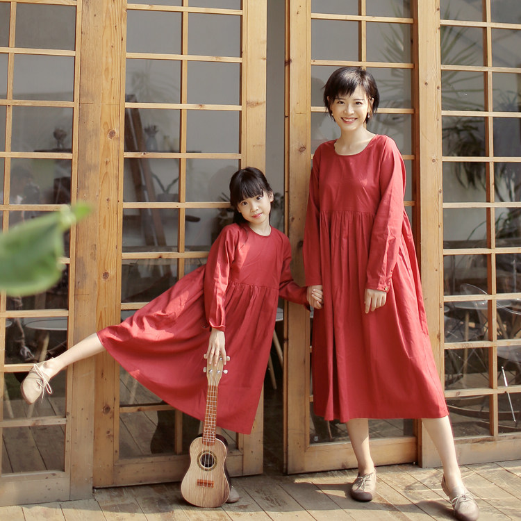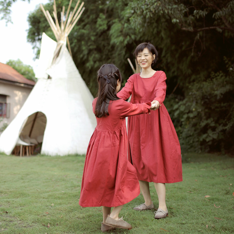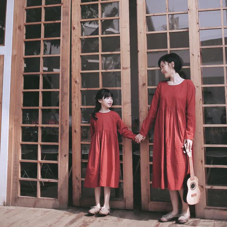 2021 spring new style shake sound literary style hemp cotton loose parent-child dress dress mother-daughter red long dress