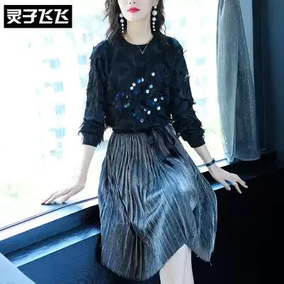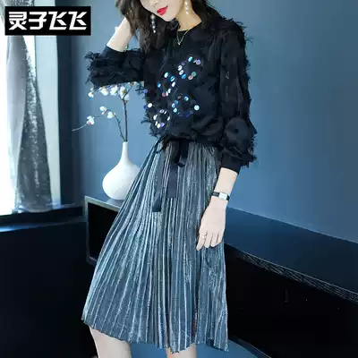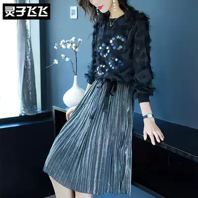 2018 autumn new black long sleeve nail bead sequin tassel feather pleated pendulum two piece suit dress women