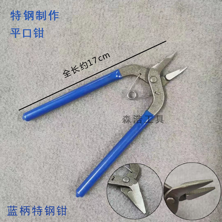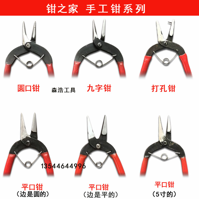 6 inch flat jaw pliers (side is flat) 6 inch flat jaws (side is round) 5 inch flat jaw 6 inch punched pliers 6 inch round jaw 6 inch figure 9 pliers spring (10 pieces) 6 inch flat jaw (side flat tip) blue handle special steel pliers pliers are manually ground, flawed, mind shooting carefully
