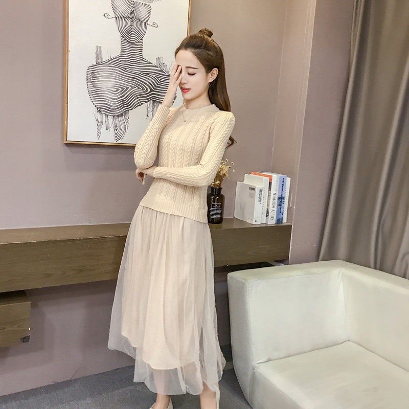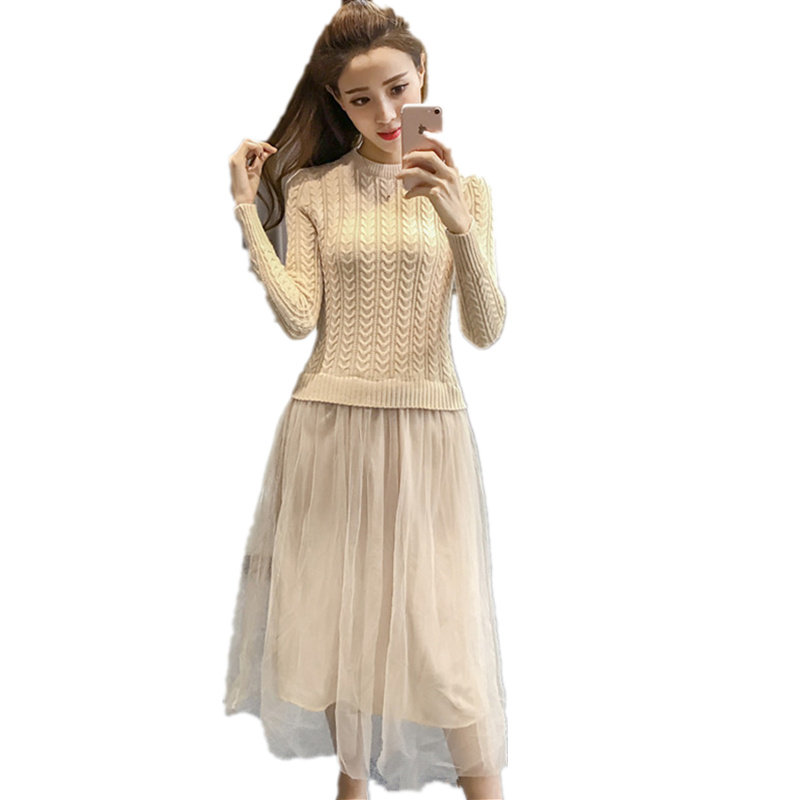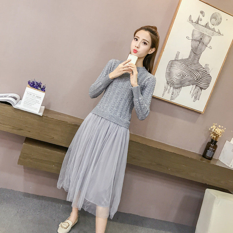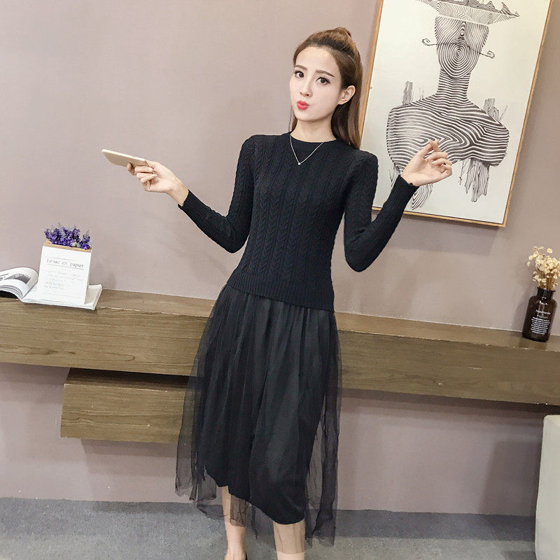 2022 Autumn Winter New Female Knit Mid dress Korean version Fashion High waist splicing mesh yarn dress Long version of the dress