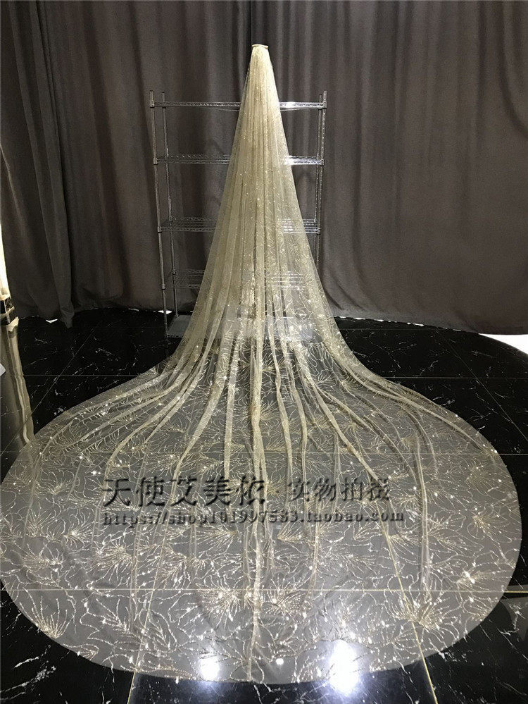 Douyin with the same style luminous champagne gold sequins net red veil super long trailing bride wedding wedding T stage flash yarn