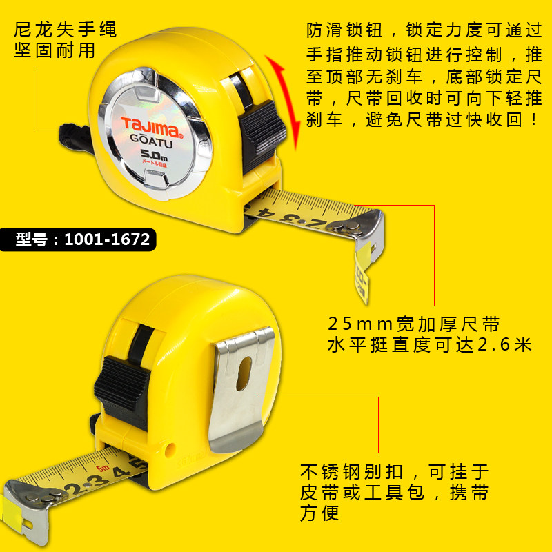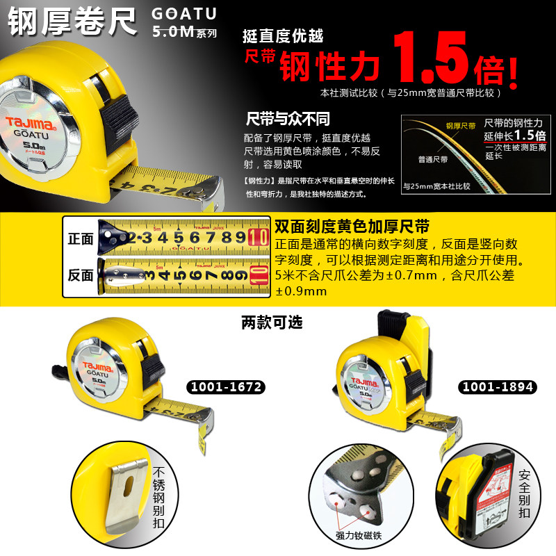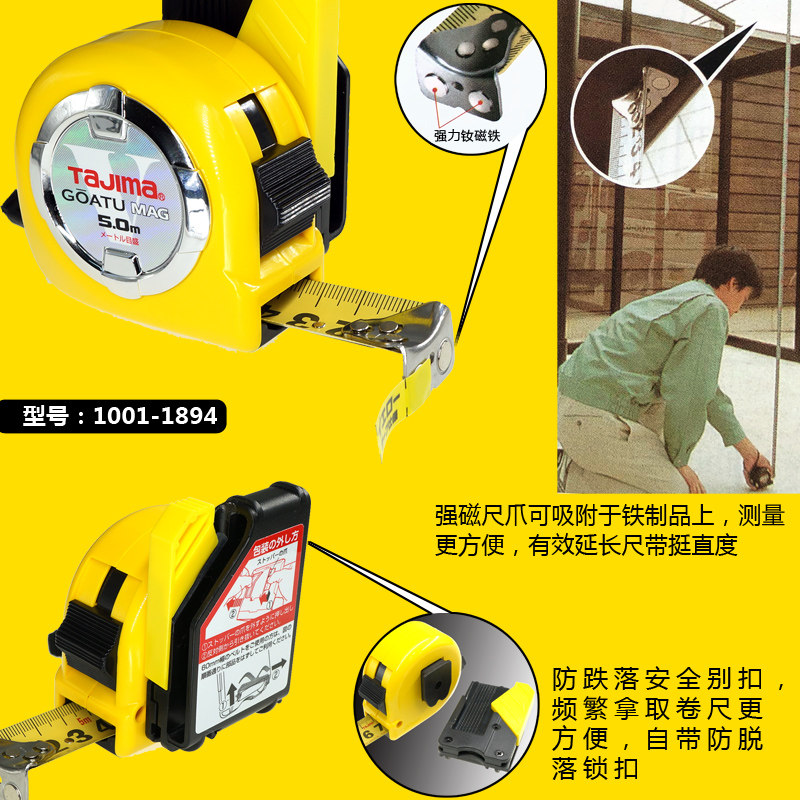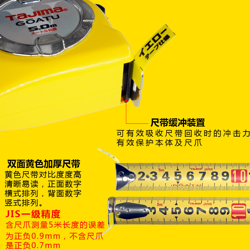 TaJIma Tianjima Roll Feet 5 m high precision double - sided yellow safety button stainless steel magnetic claw thickening steel ruler