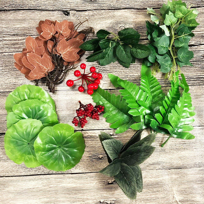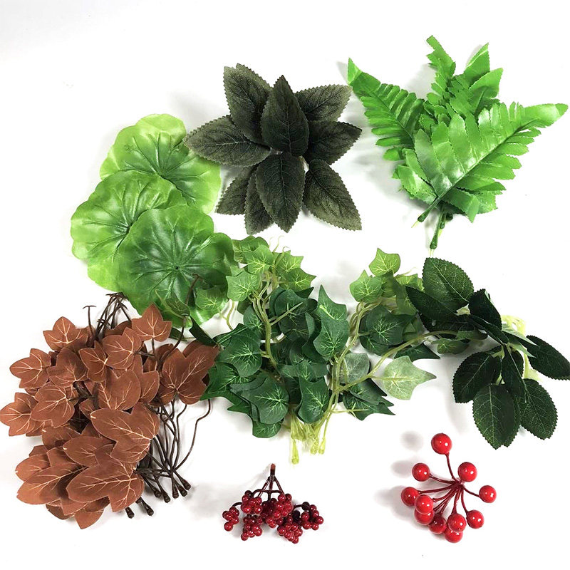 Carbaceous grass about 30 g pack red leaves primary color leaves pine piece about 50 g pack small red berries 1 bunch of big red berries 1 bunch autumn leaves 10 pack green ground melon leaves 10 pack lotus leaves 10 pack trigemina leaves 10 pack small six leaves 10 pack baubo stem leaves 10 pack pink leaves 5 pack