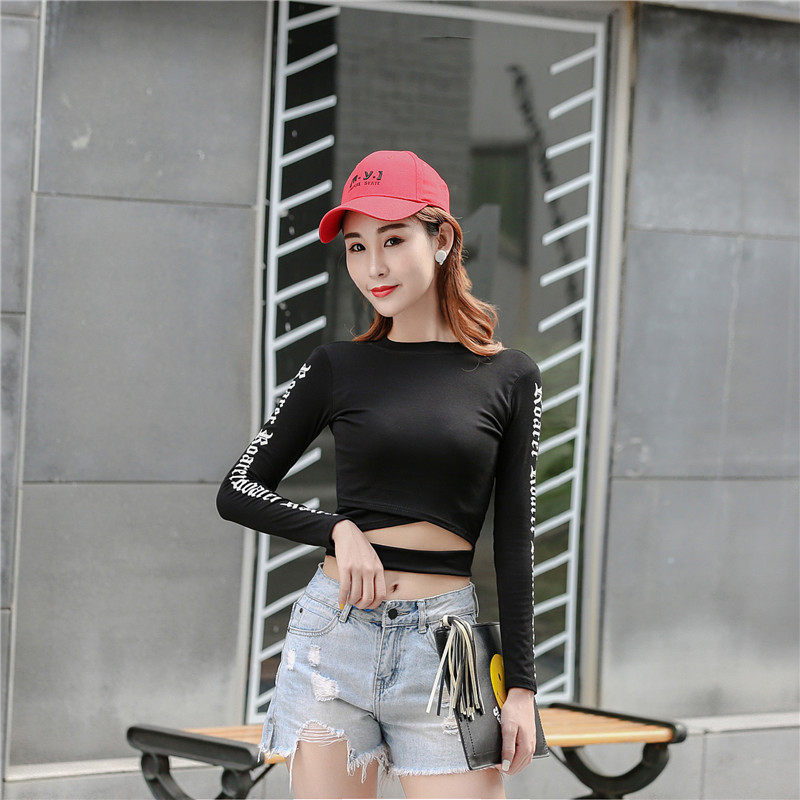 Sexy skinny jazz dance top women's crop top fitness sport T-shirt long sleeves letter print yoga suit crew neck