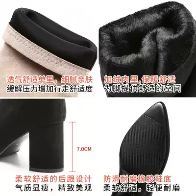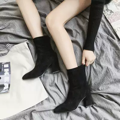 High heel boots female 2021 new spring and autumn single boots elastic apricot color pointed tube suede frosted coarse heel thin boots