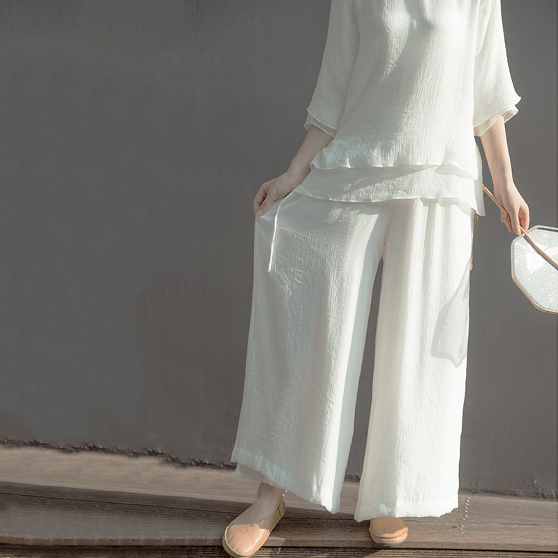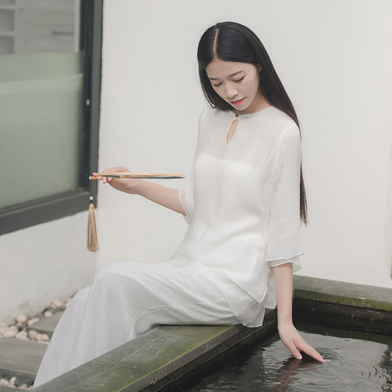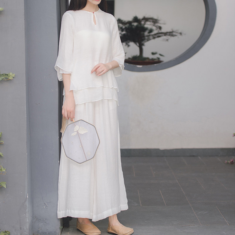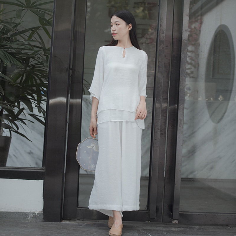 Chinese wind double layer cotton linen jade clasp yoga blouse loose double layer Zen suit tea suit workwear SY110
