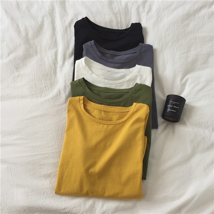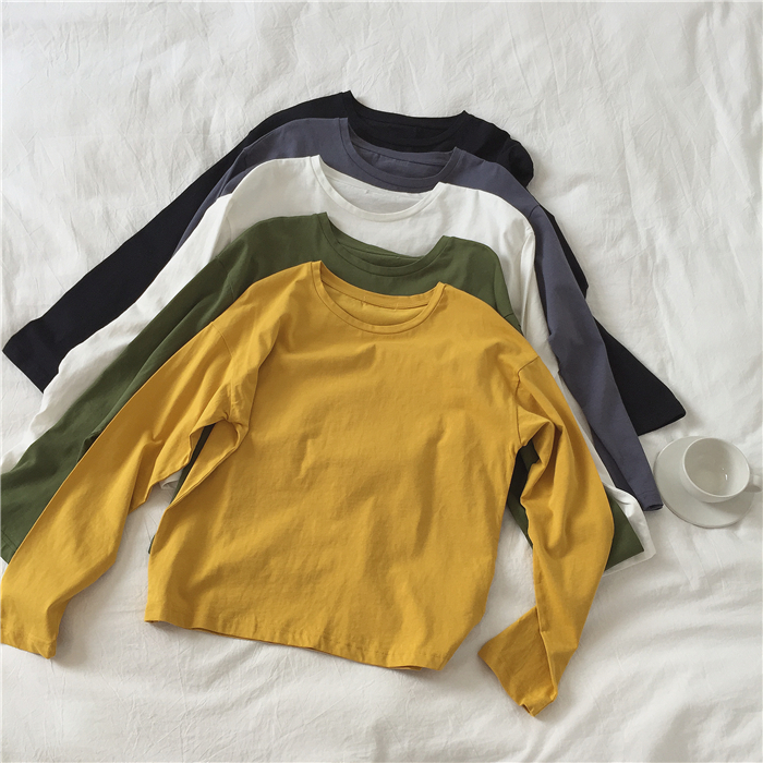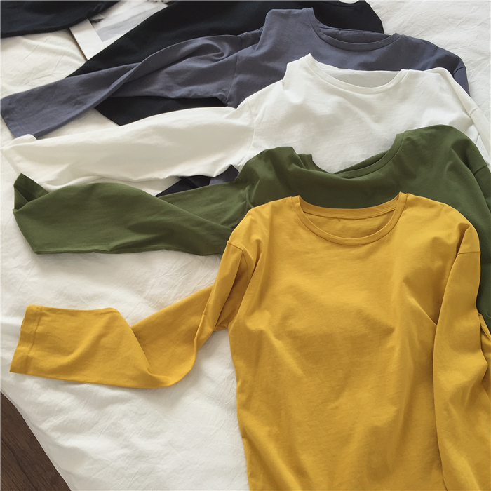 muzi long sleeve T-shirt female spring 100 lap loose beat bottom pure cotton white student tide round collar Korean version pure color blouse