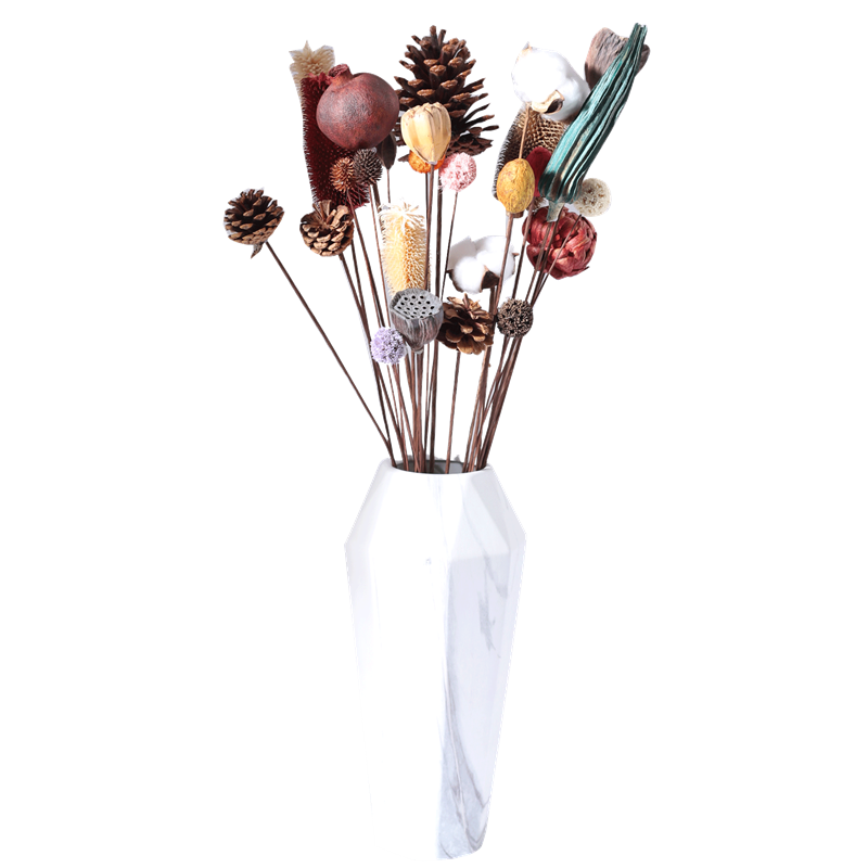 Small poplar branches (flower heads 3 cm) large pine nuts (fruit head length 9 cm) white road branches (flower heads diameter 2 cm) pink road branches (flower heads diameter 2 cm orange color road branches (flower heads)