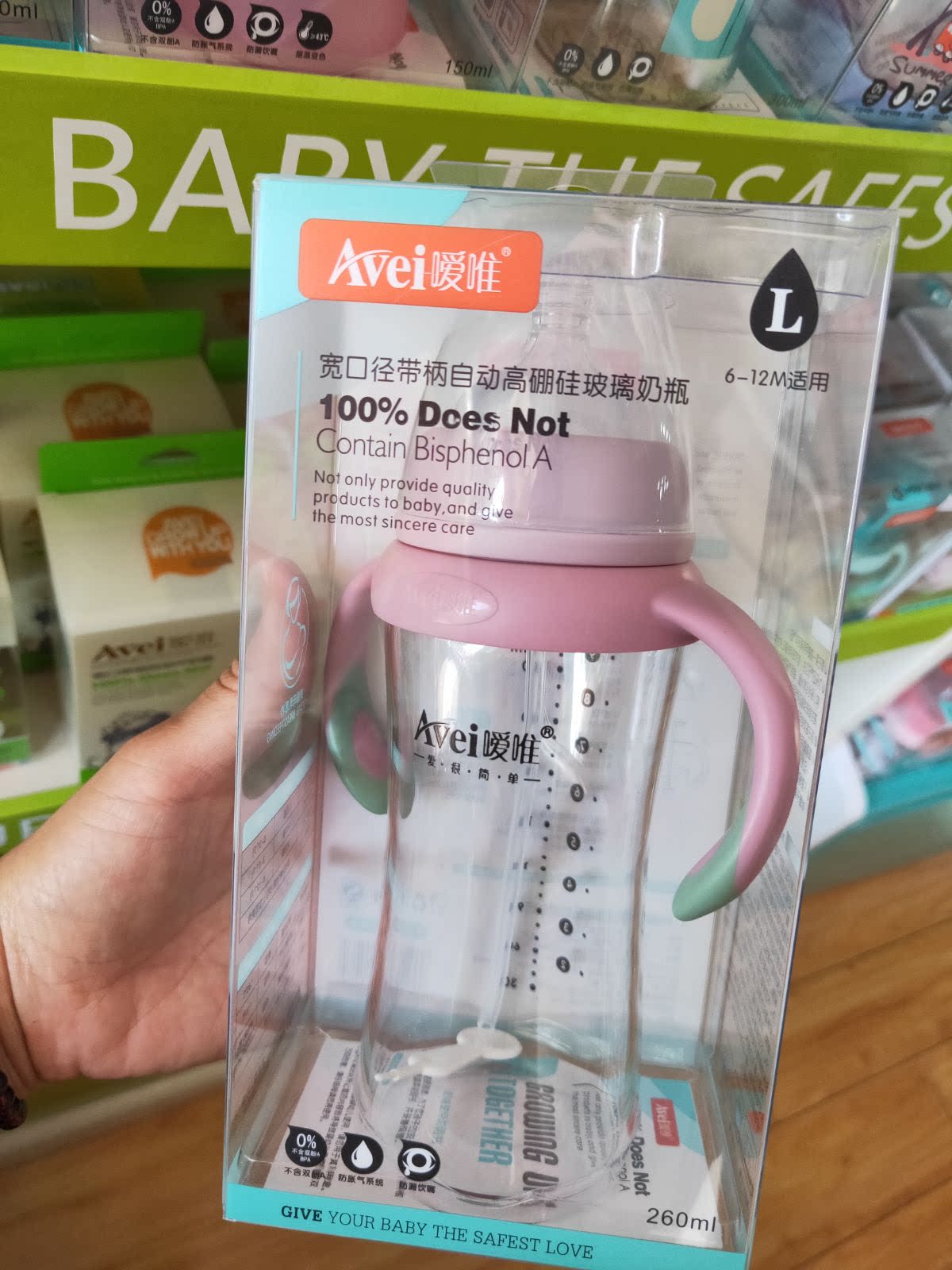 Automatic glass feeding bottle 260ml with a wide mouth.