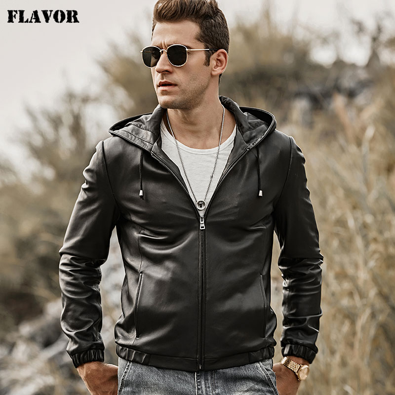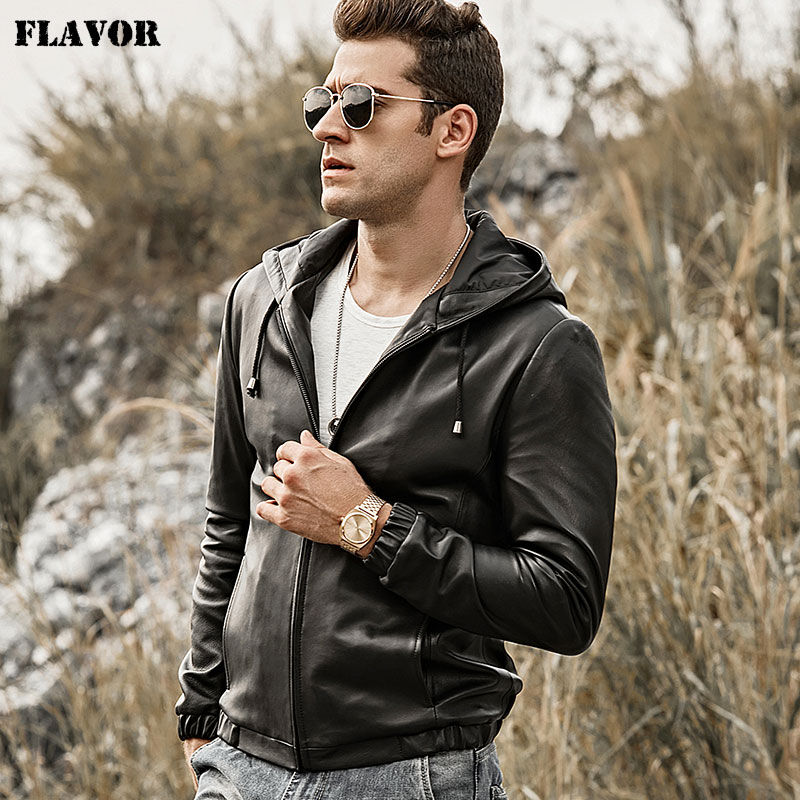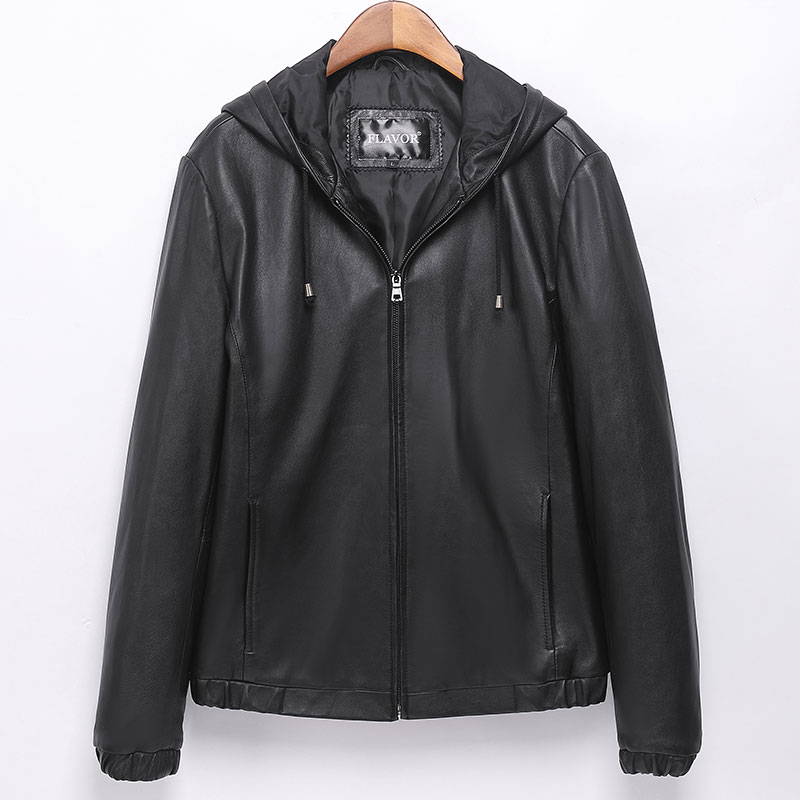 Haining leather jacket men's short hooded casual men's sheep leather jacket coat slim coat trend