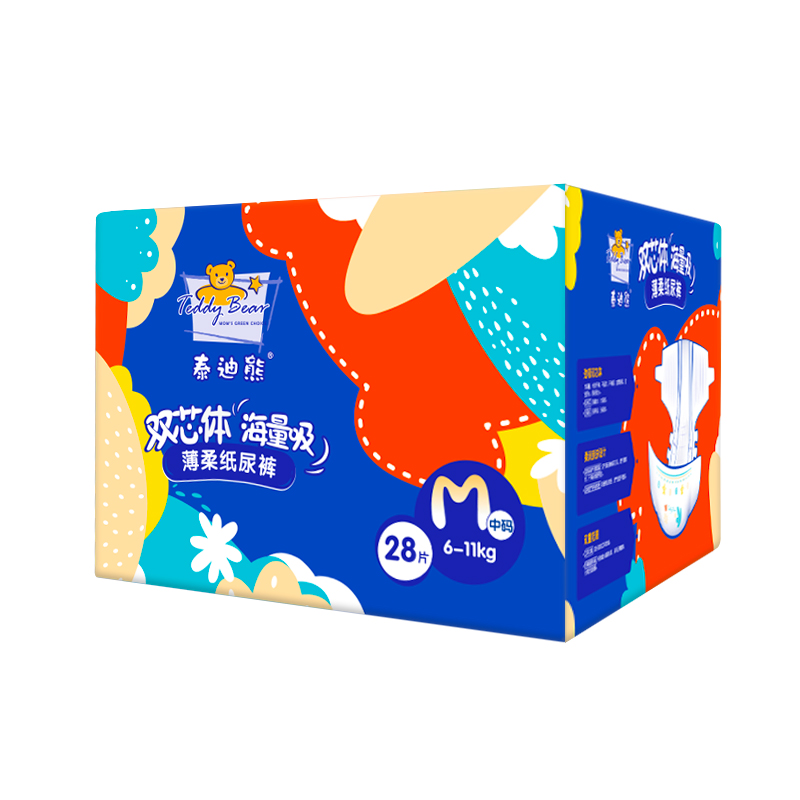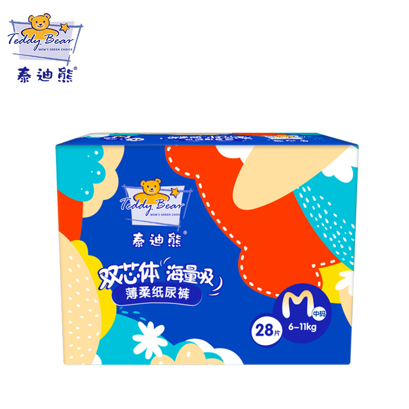 Teddy bear double core body mass suction thin soft paper diaper breathable dry and dry night with urine not wet M code 28 pieces summer f