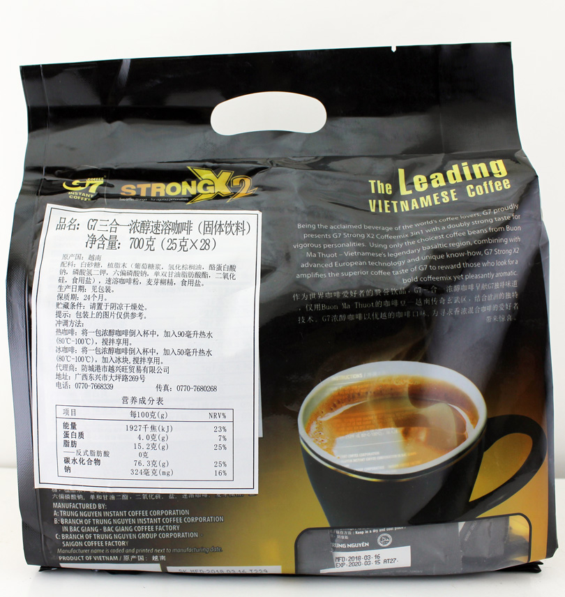 Vietnam imported Zhongyuan G7 aromatic espresso instant coffee 3 in 1 coffee powder 700g