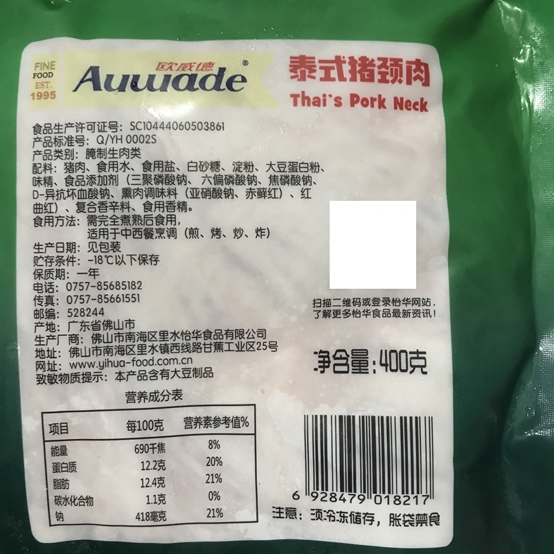 Ovide Thai pork neck 400g smoked marinated pork loose plate meat refreshing smooth charcoal grilled pork neck meat