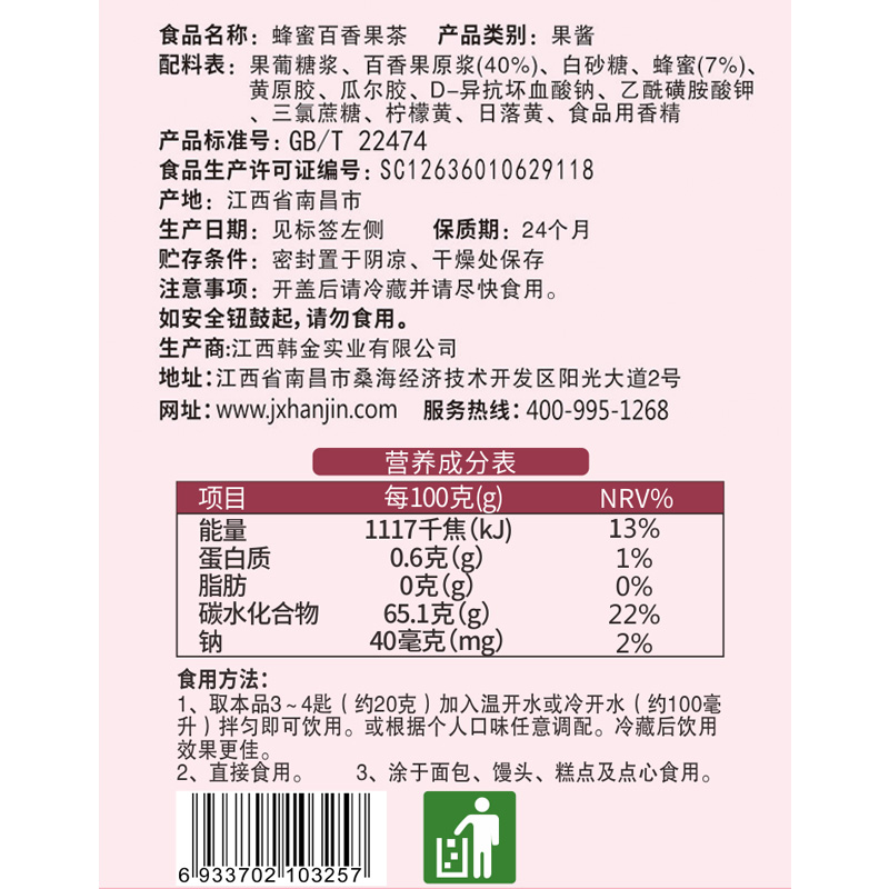 Fructose syrup Passion fruit puree White sugar Honey Food additives (see label) Food flavor