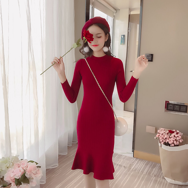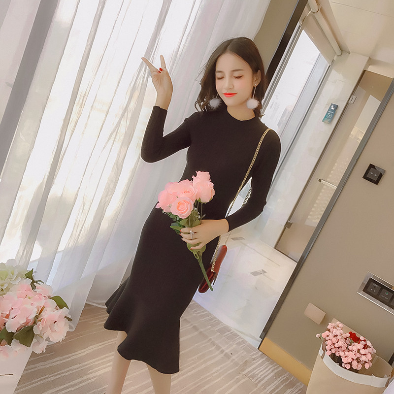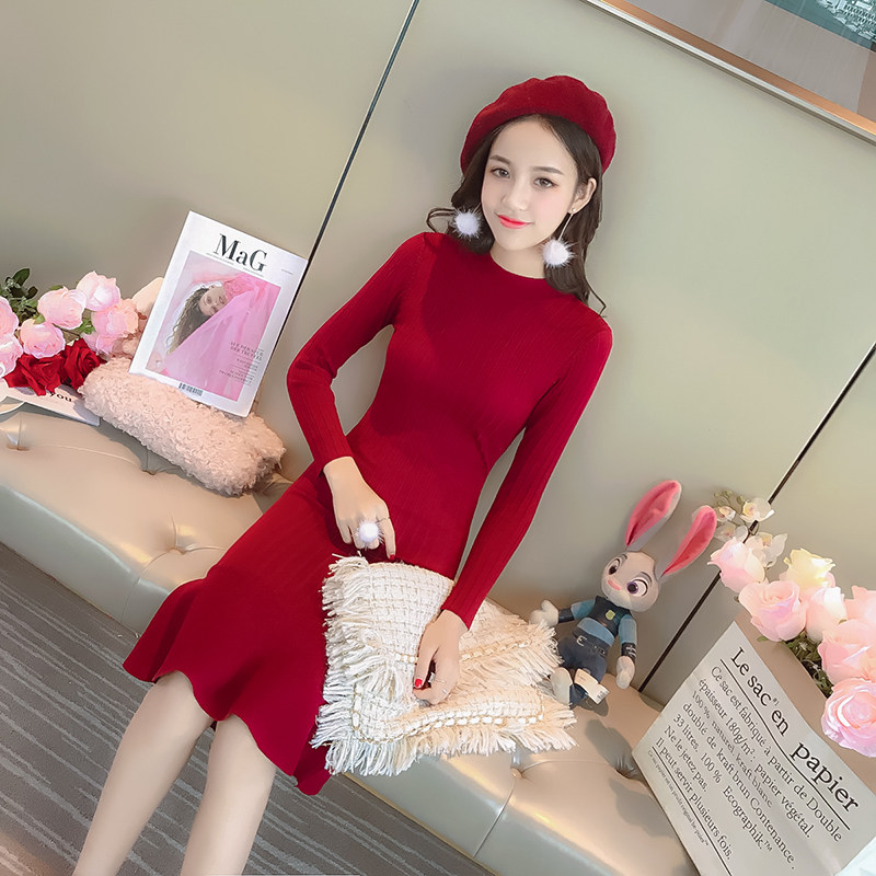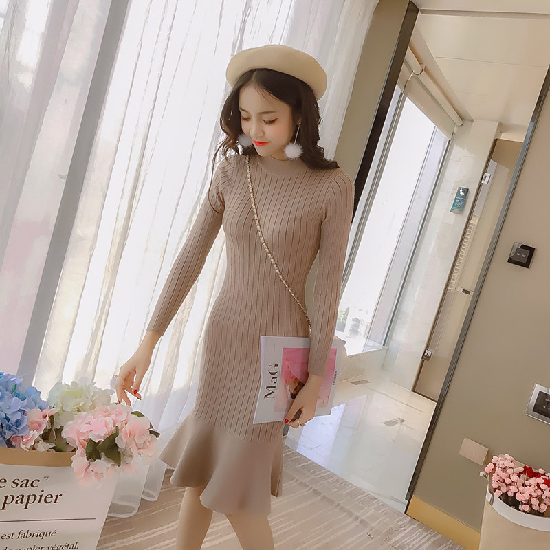 Fashion sweater women's 2017 autumn and winter new round neck pullover slim ruffle mid-length hip knitted base skirt