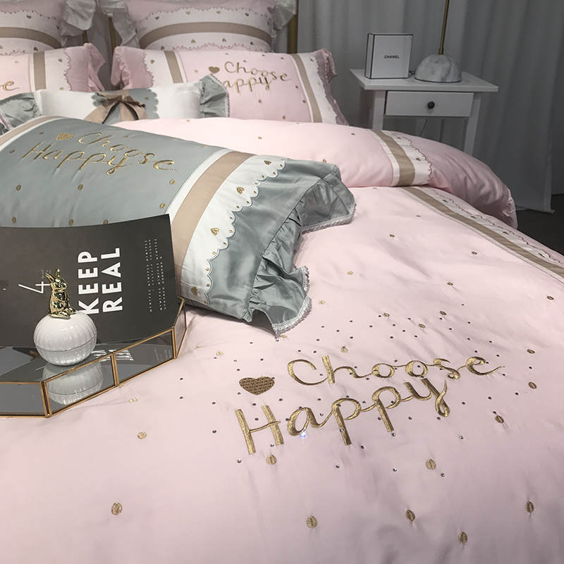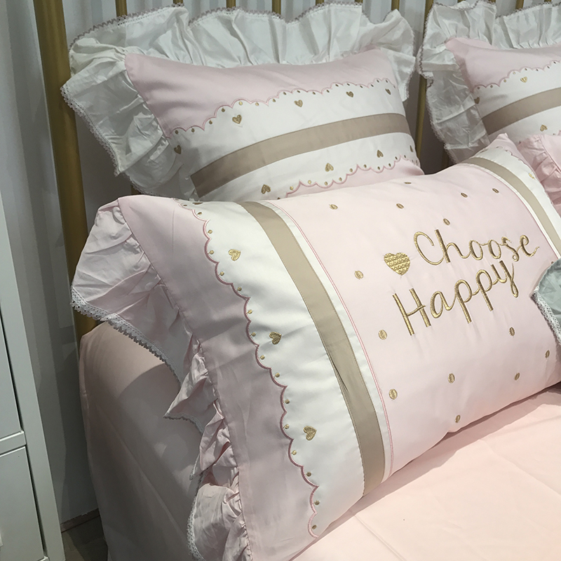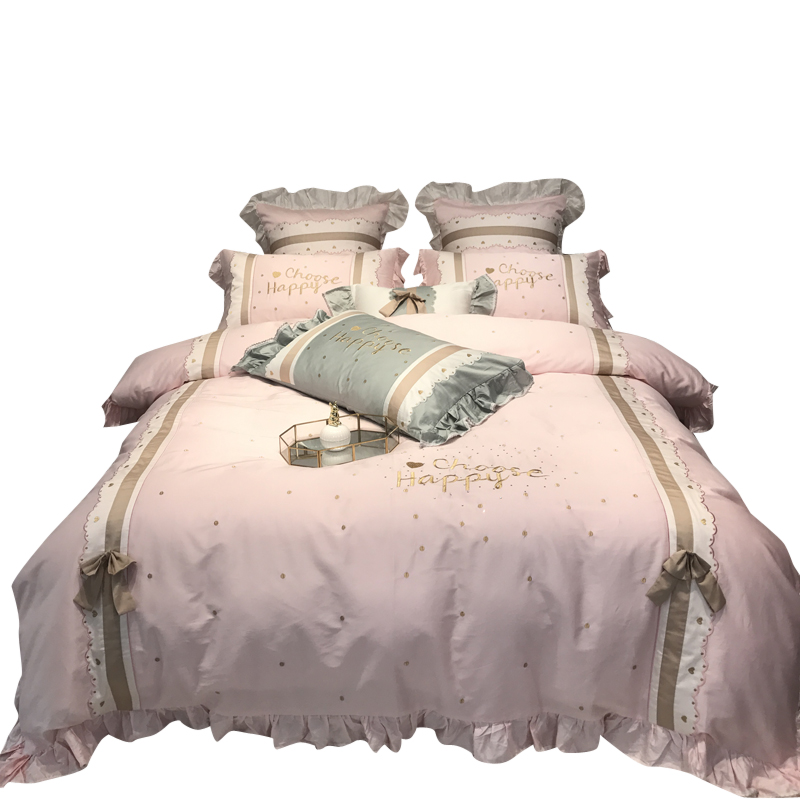 Pure cotton princess wind 60 long suede cotton tinged embroidered with four pieces of pink lotus leaf edge full cotton cute bed