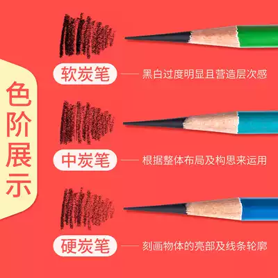 Soft charcoal 12 pcs Medium charcoal 12 pcs Hard charcoal 12 pcs 12 pcs Combination pack(Soft x6 medium x4 hard x2) Soft charcoal 12 pcs Rubber utility knife Paper eraser pen 3 pcs Medium