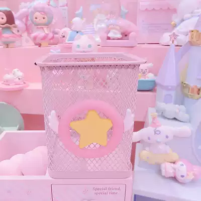 Cute girl heart pink grid pen holder Metal wrought iron desktop pen holder Stationery storage box square makeup brush holder