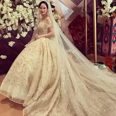 Wedding dress bride 2021 new champagne gold one-shoulder princess heavy industry Hepburn starry sky crystal long tail