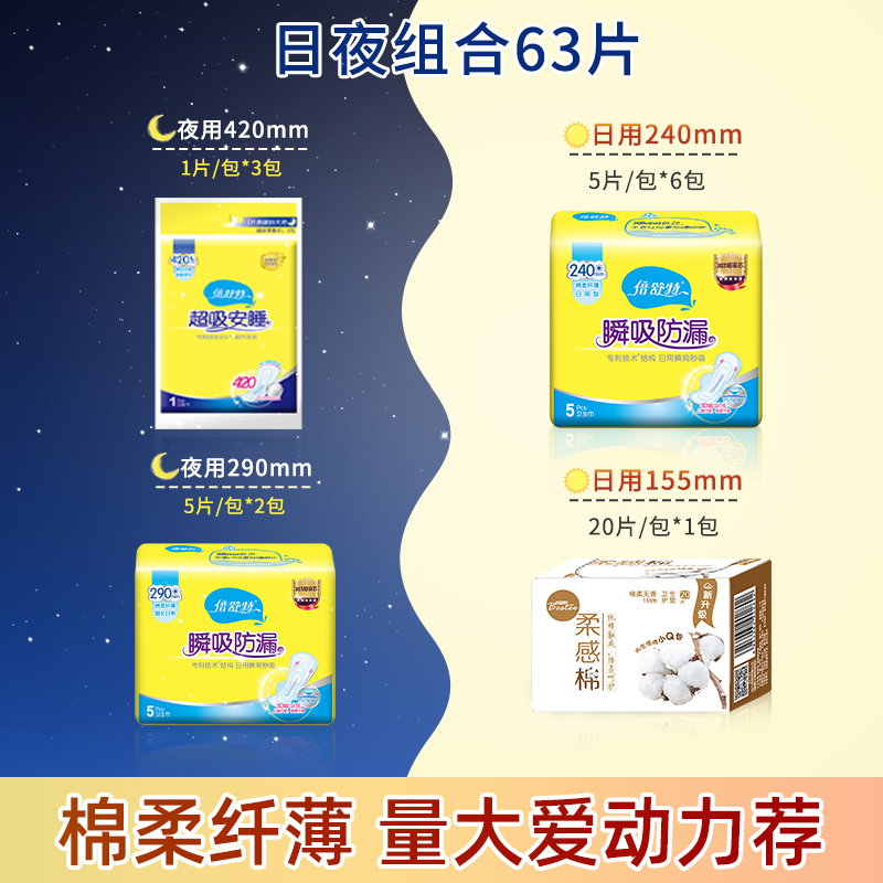Beishuite leak-proof sanitary napkin aunt towel day and night with cotton soft women's pad combination 63 pieces 240mm FCL
