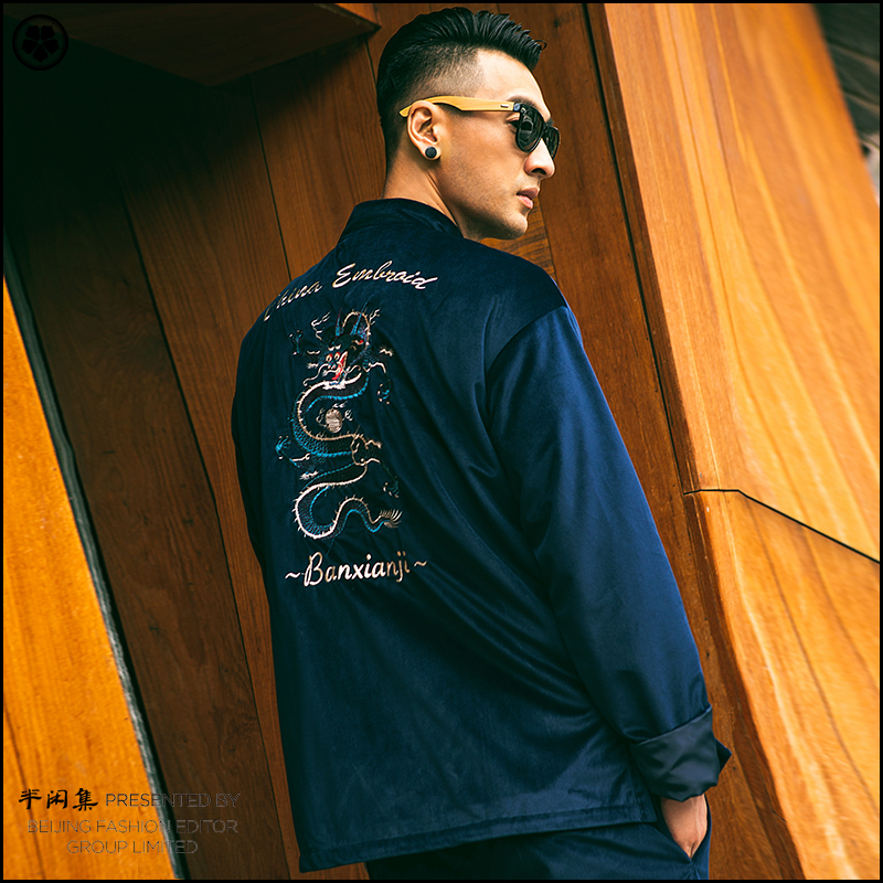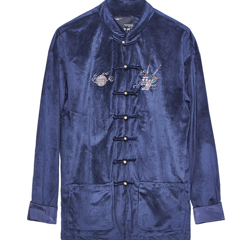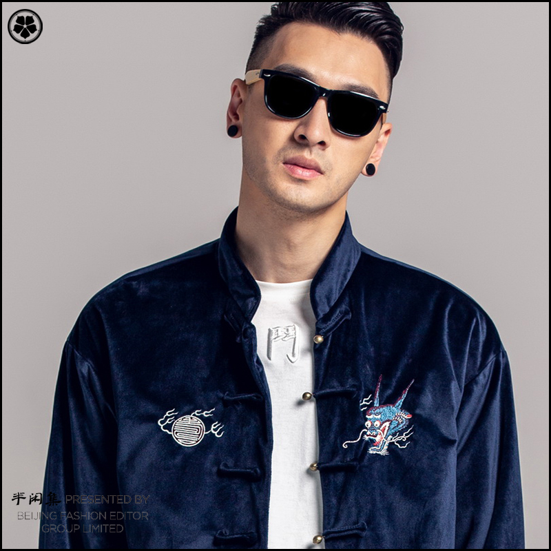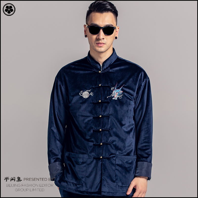 Half Idle Set Embroidery Velvet Tang Dress Fashion Dragon Dry Kun Blue Youth Disc Buckle Retro Blouse China Craze Men's Clothing