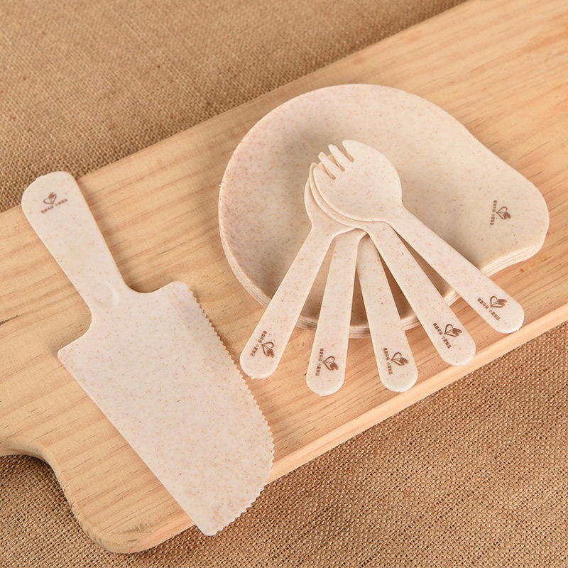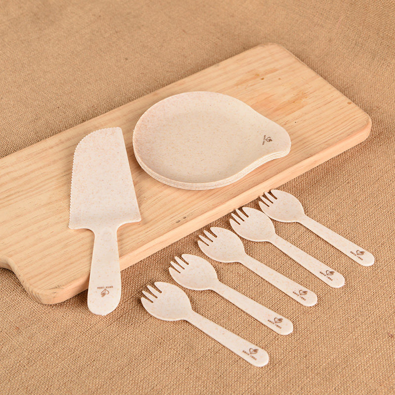 Food grade wheat straw water drop cake cutter and fork disc disposable dish birthday cake tableware set