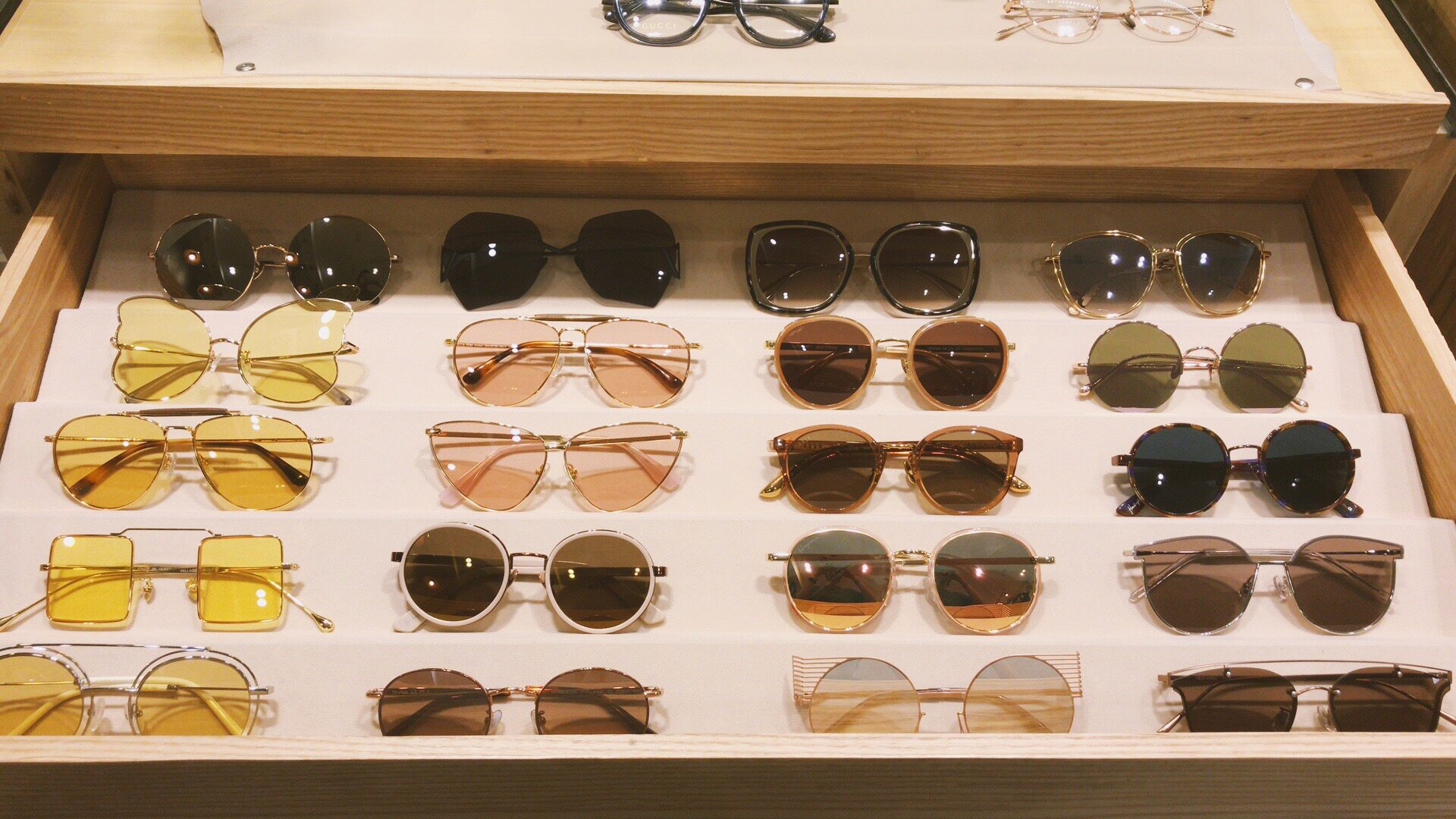 Custom trapezoidal mall Cinema Counter Shelves Sunglasses Optical Glasses Optical glasses drawers Inside Display lattice Barrier Tray