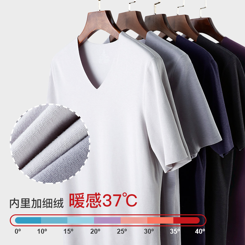 Rice Straw Man Warm Underwear Men Short Sleeve Autumn Winter Plus Suede Thick Cotton Sweatshirt Youth Winter V Collar Undershirt T-shirt-Taobao