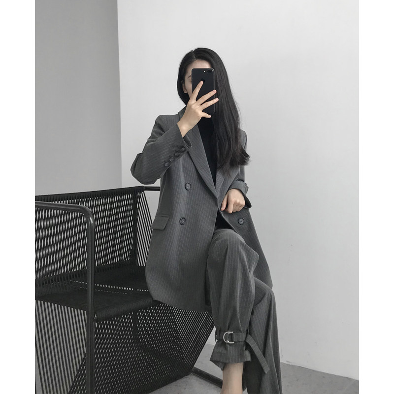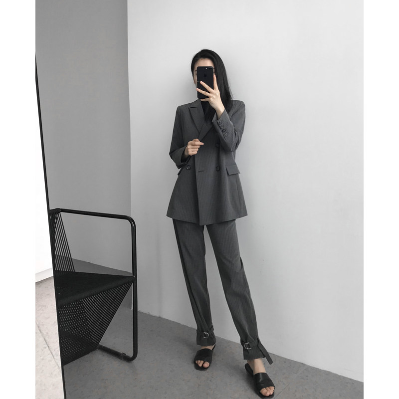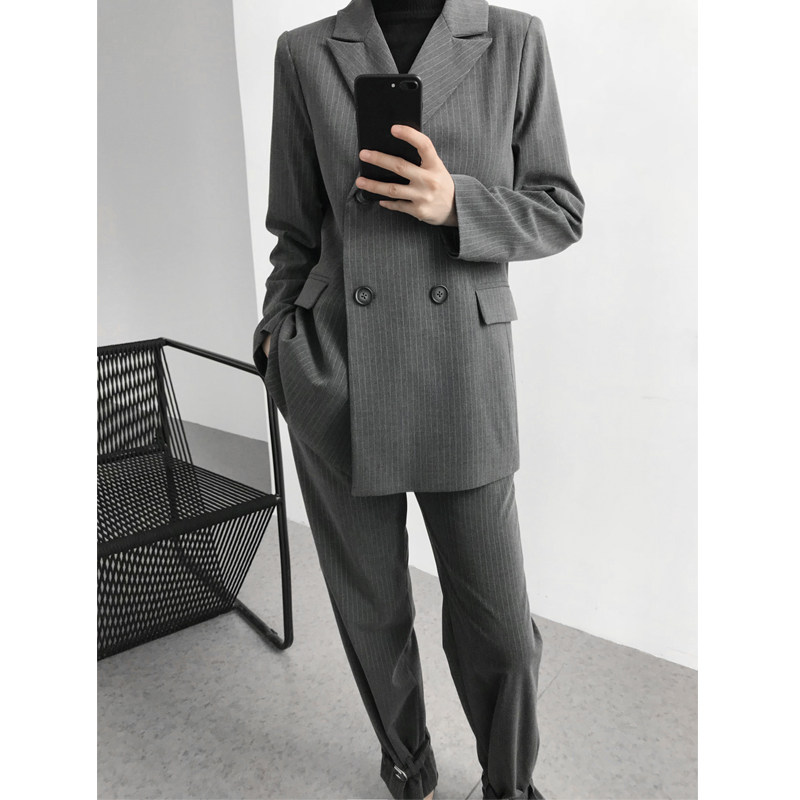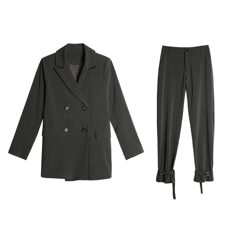Gray Striped Small Suit Design Sense Casual Fashion Set Women 2021 Spring Two Piece Korean Suit Jacket