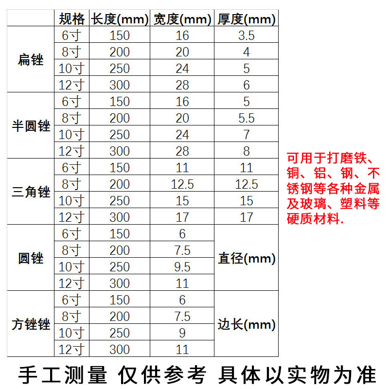 6 inch (five pieces)-Send small file 8 inches (five pieces)-Send small file 10 inches (five pieces)-Send small file 12 inches (five pieces)-Send small file 6 inches (flat file)1 8 inch (flat file)