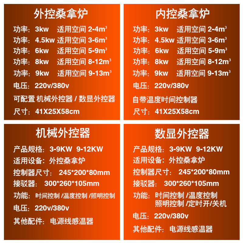 3kw external control sauna stove (with digital display controller) 4.5kw external control sauna furnace (with controller) 6kw external control sauna furnace (with digital display controller) 8kw external control sauna furnace (with digital display controller) 9kw external control sauna furnace (with digital display controller) 3kw internal control sauna furnace 4.5kw internal control sauna furnace 6kw internal control sauna furnace 8kw internal control sauna furnace 9kw internal control sauna furnace 10.5kw external control sauna furnace (excluding controller) 12kw external control sauna furnace (excluding controller) 15kw external control sauna furnace (without controller) 18kw external control sauna furnace (with connection external controller) 21kw external control sauna furnace (with connection external controller). 24kw external control sauna stove (with connecting external controller) mechanical 9--16kw controller 3kw external control sauna stove (without controller) 4.5kw external control sauna furnace without controller) 6kw external control sauna furnace (without controller) 8kw external control sauna furnace (without controller) 9kw external control sauna furnace (without controller)