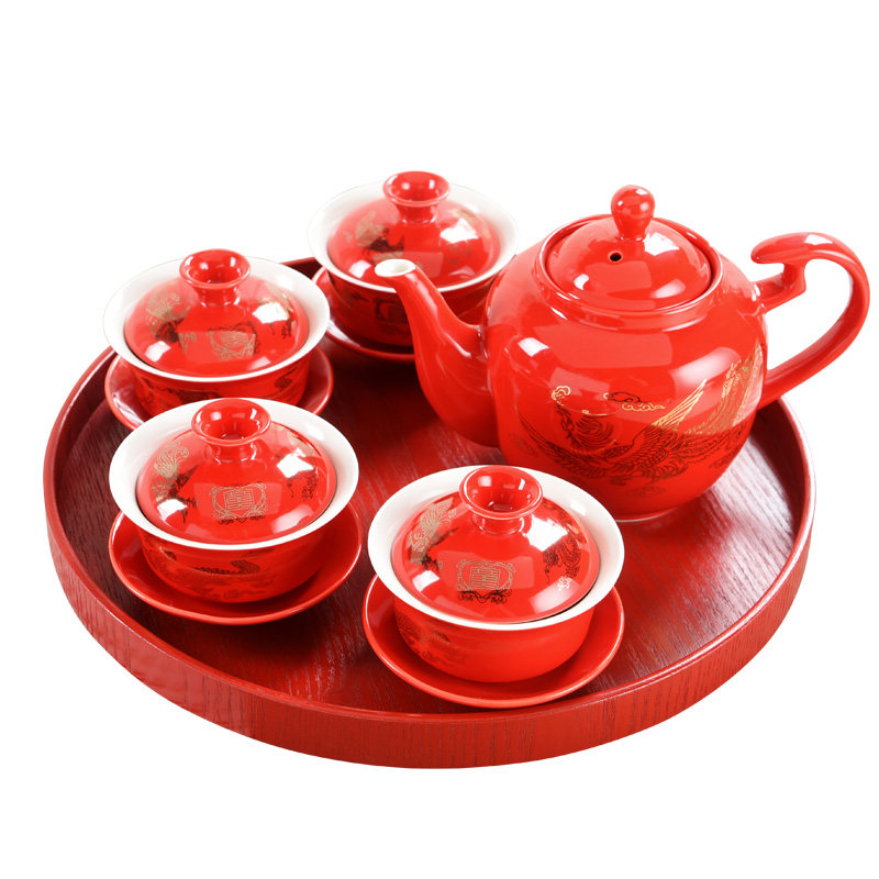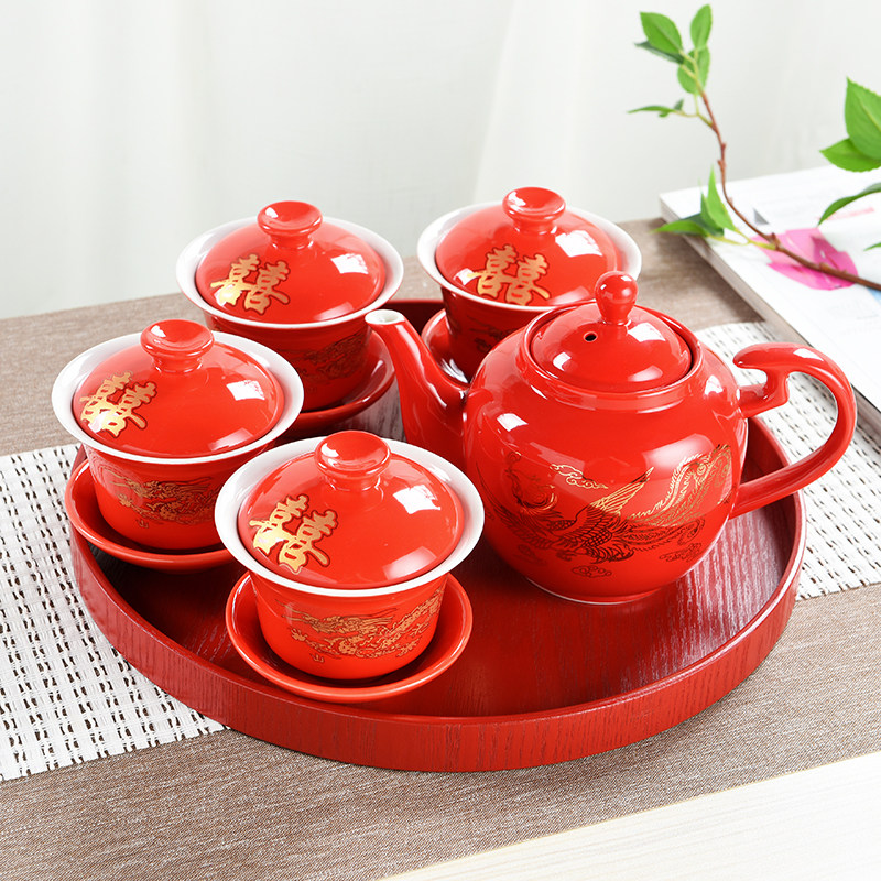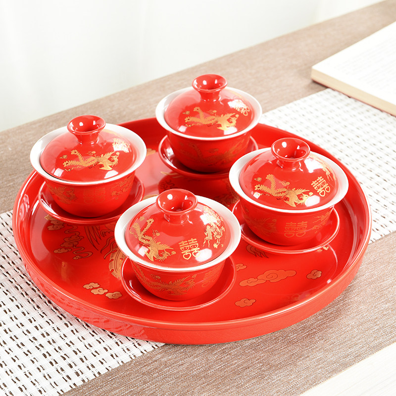 4 toast cups Wedding set Dragon and Phoenix double celebration pair of cups Red tea set three-color cover bowl Ceramic Chinese teapot