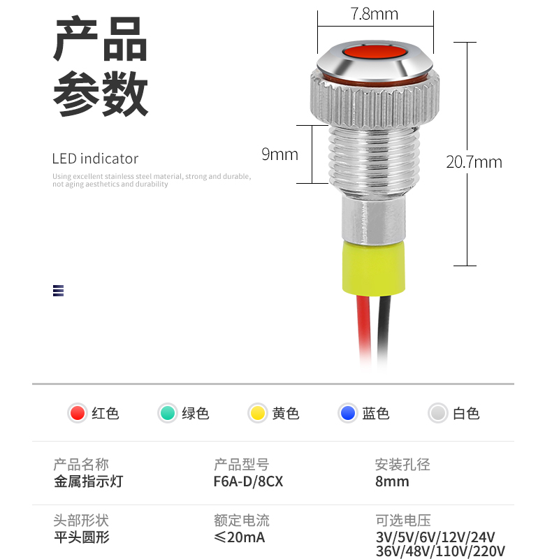 8MM220v power signal indicator LED Small light emitting diode with resistance 24v 12v 6v Waterproof