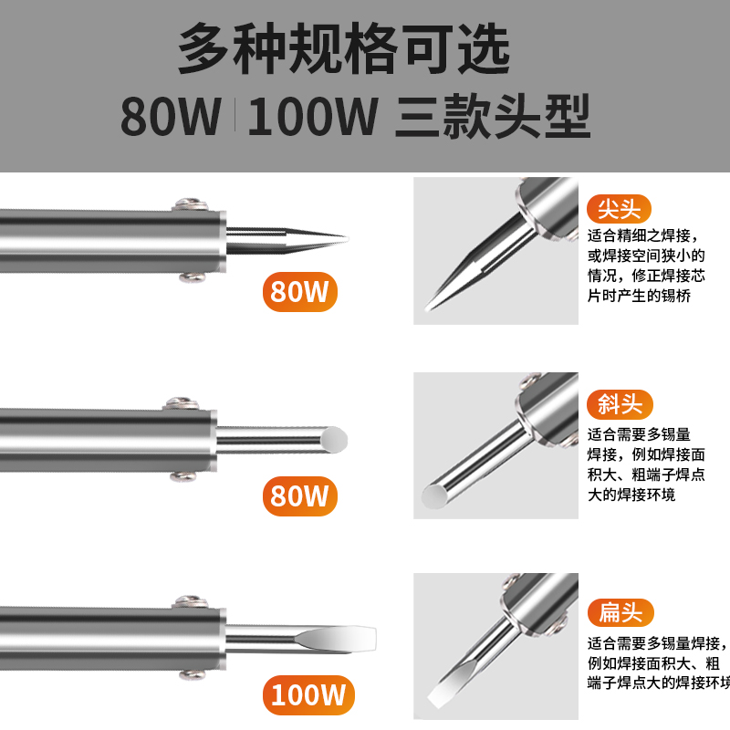 HS-80C soldering iron (pointed) standard HS-80C soldering iron (horseshoe head) standard HS-80C soldering iron (flat head) with HS-80C soldering iron (pointed) on the upper hand 4 pieces H
