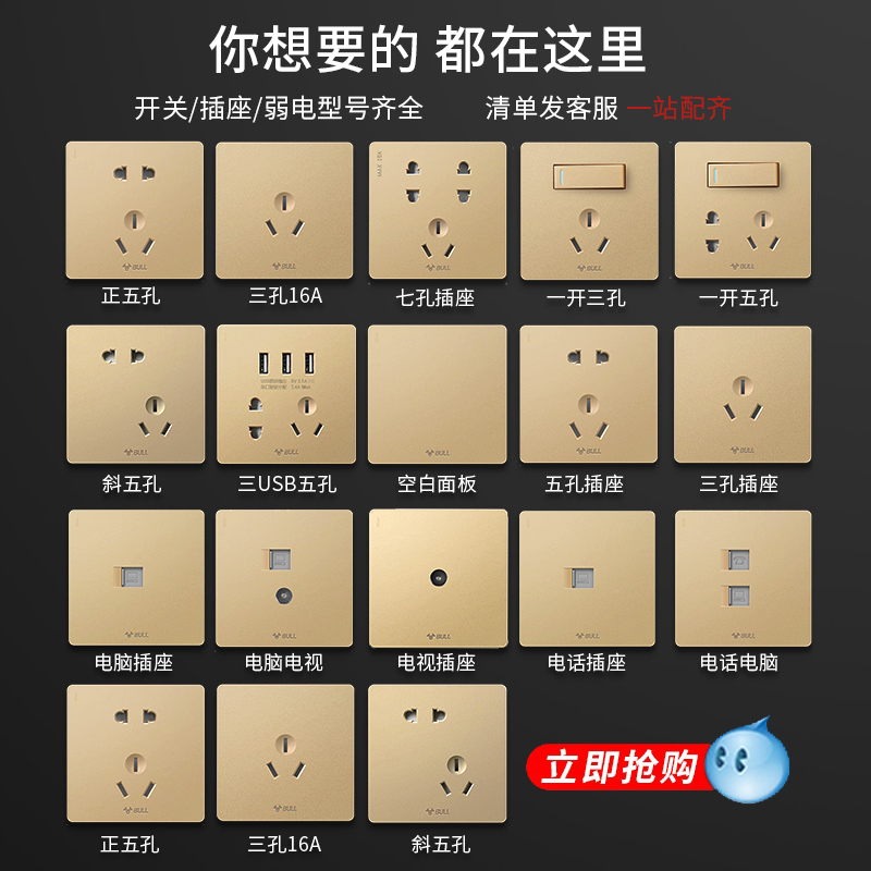 Bull switch socket home flush mounted 86 type wall socket with five-hole socket panel two-three-hole gold switch