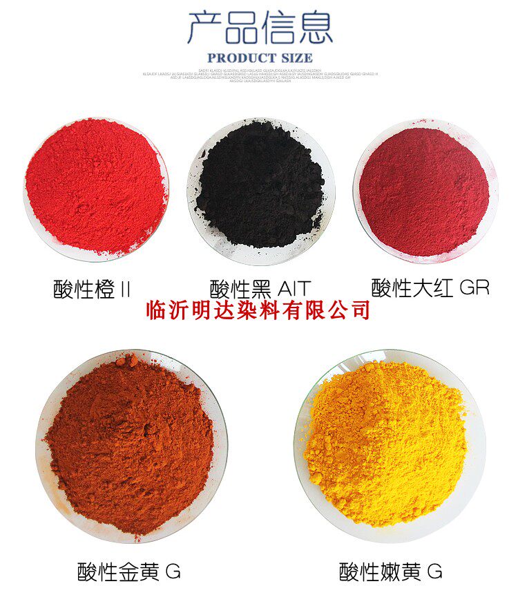 Acidic large red GR acidic black ATT acidic orange 2 acidic tender yellow 2G acidic gold yellow G acidic particle raw green acidic medium brown acidic lake blue A acidic green acidic large red A