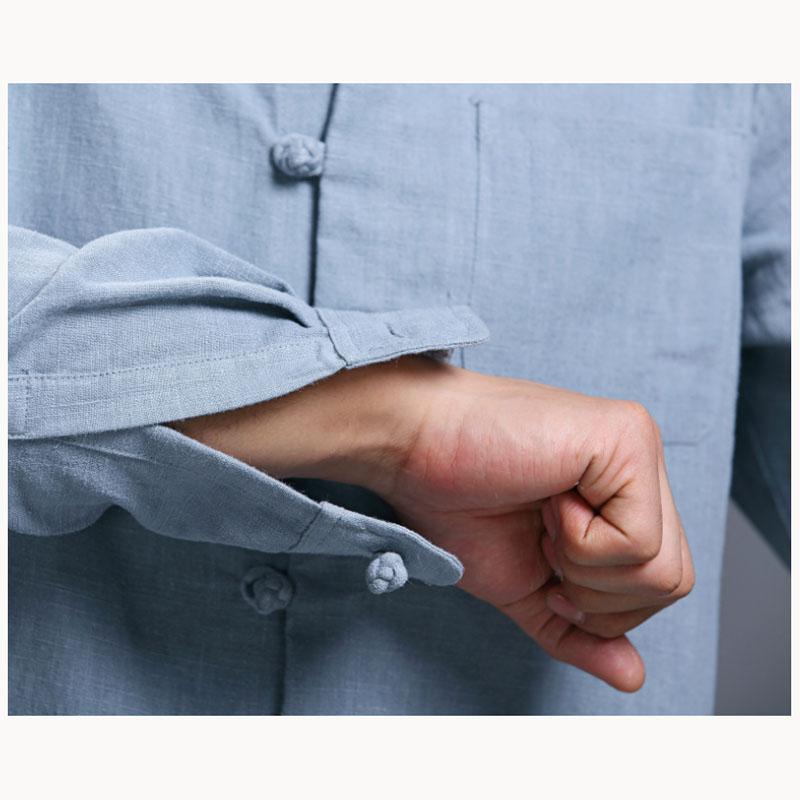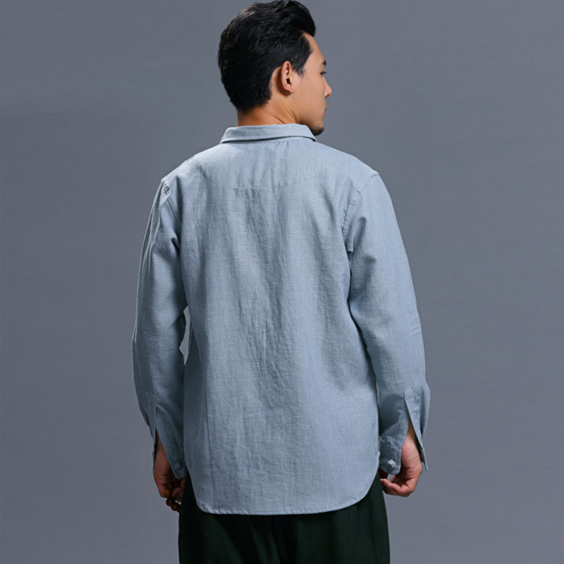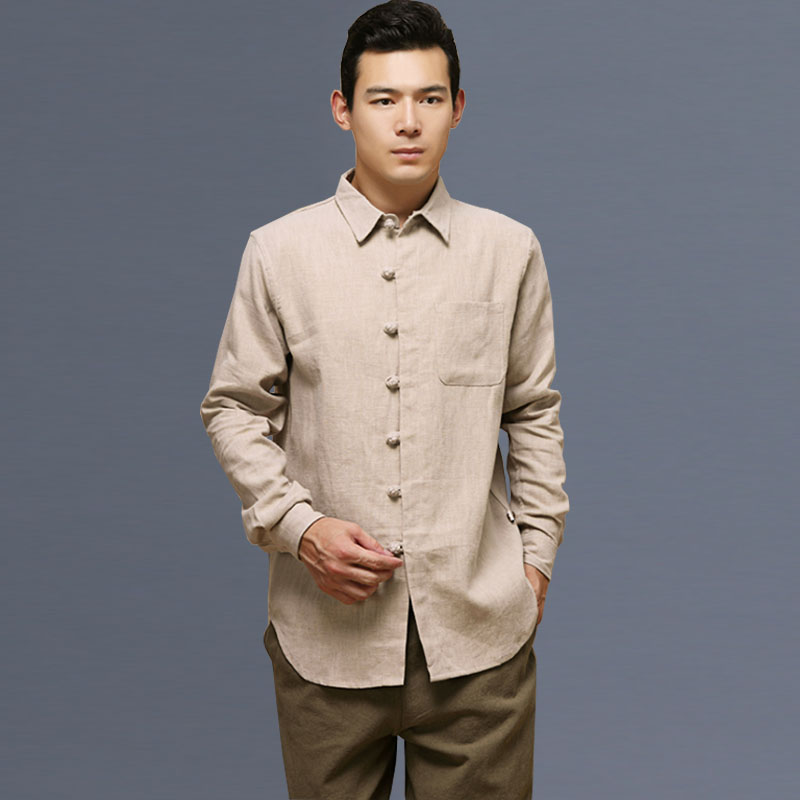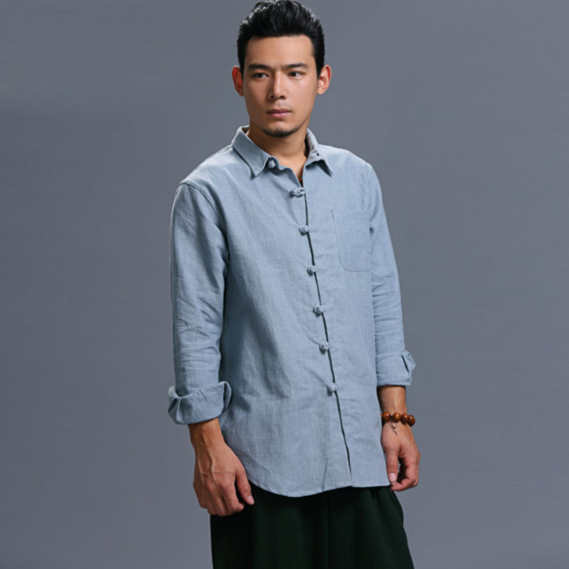Chinese style men's retro linen casual shirt loose Tang suit plate button top Zen tea long sleeve square collar shirt men